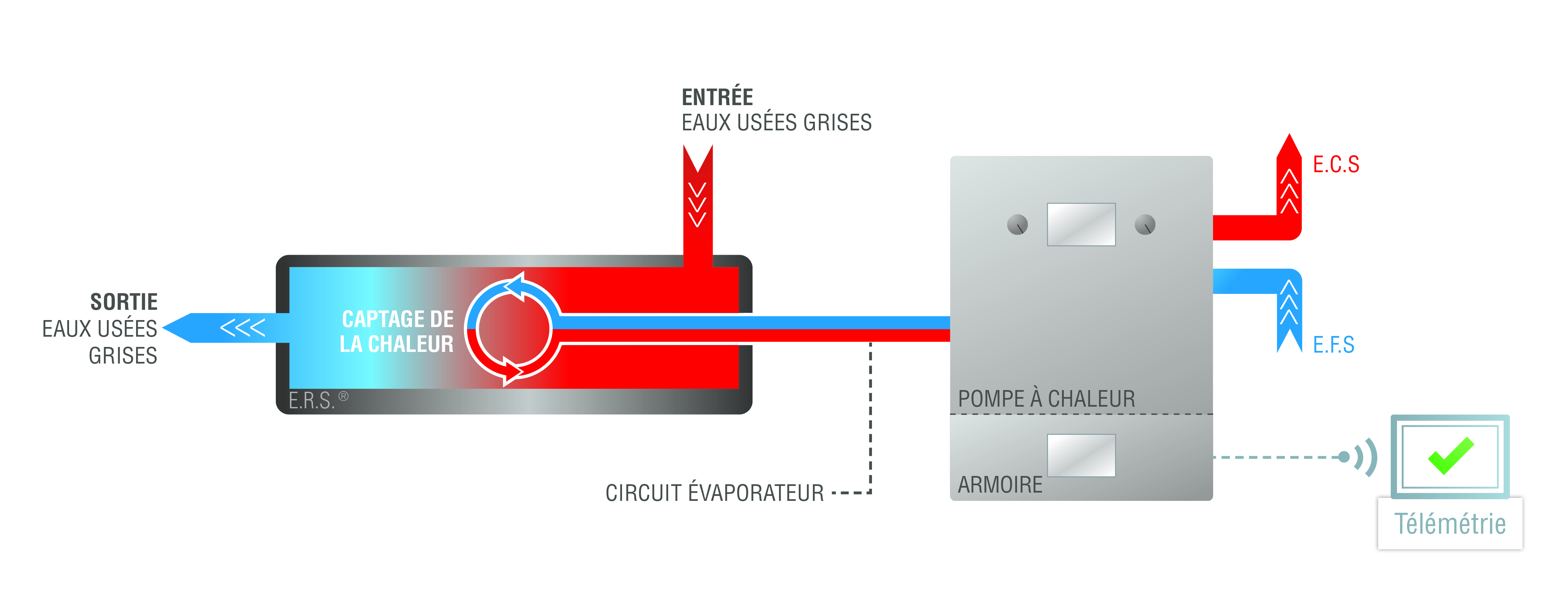 Le principe est simple, poursuit-il : « L’eau des logements, entre 28 et 30 °C, est évacuée en passant dans une cuve autonettoyante équipée d’échangeurs qui font l’objet de 4 brevets. À la sortie de la cuve, l’eau est aux alentours de 10 °C, et il n’y a aucun décalage entre le rejet et la production. Avec la nouvelle génération de PAC, nous obtenons un COP de 4,2 et nous pouvons aussi en parallèle puiser les calories issues d’autres sources, telles des condensats de réseau urbain de vapeur ou bien encore d’une moquette solaire. »