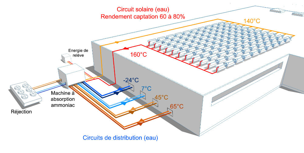 « Nous avons donc opté pour un capteur solaire à concentration cylindro-parabolique, le miroir parabole en verre concentrant le rayonnement solaire sur le tube sous vide au centre du capteur, en couplage avec une machine à absorption eau-ammoniac. Ensuite, la distribution du froid et du chaud dans le bâtiment tertiaire est à eau. »