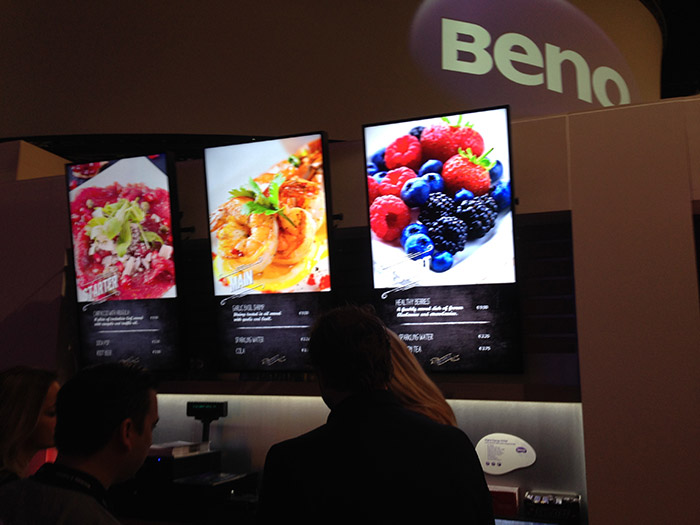 Plus besoin d’ordinateur, tout se passe sur une tablette ou un smartphone. Il suffit de prendre une photo du produit à promouvoir, de le récupérer dans la bibliothèque d’images, d’y ajouter un texte promotionnel et de valider. Le message apparaît immédiatement sur les écrans et le client est informé en temps réel. Le gérant d’une boutique, ou l’accueil d’une entreprise, peut, au gré de la journée, modifier les messages très rapidement. BenQ présentait le DH550C, un afficheur double-face très fin de 55″ (140 cm de diagonale). Un hall entier lui était consacré.