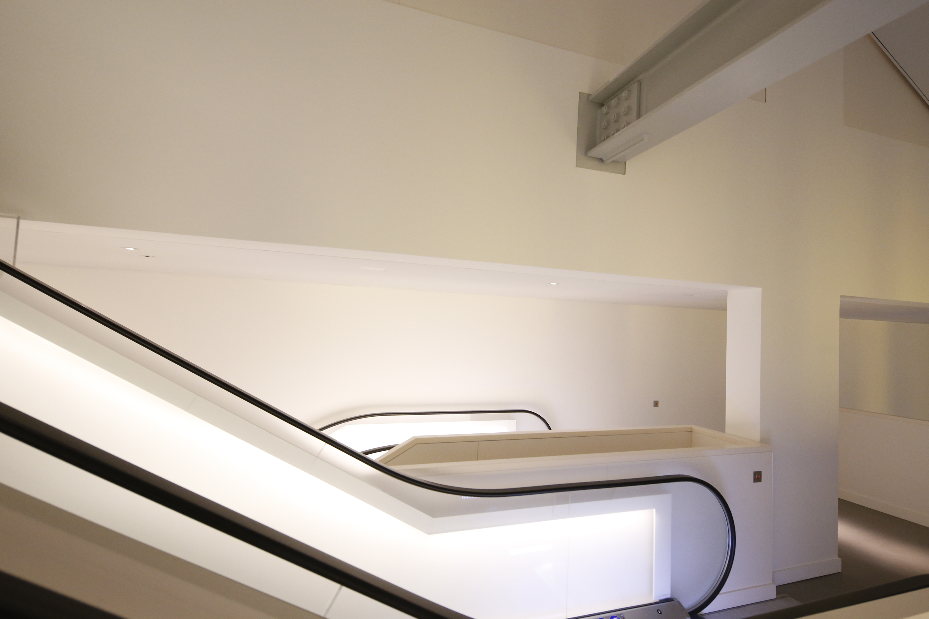 Dans les circulations, des downlights ponctuent le sol de halos lumineux tandis que les rampes d’escalators sont soulignées de rubans LED. Tous les espaces, hall d’entrée, librairie, zones de transition, bénéficient de niveaux d’éclairement appropriés à leur fonction, avec une même température de couleur de 3 000 K.