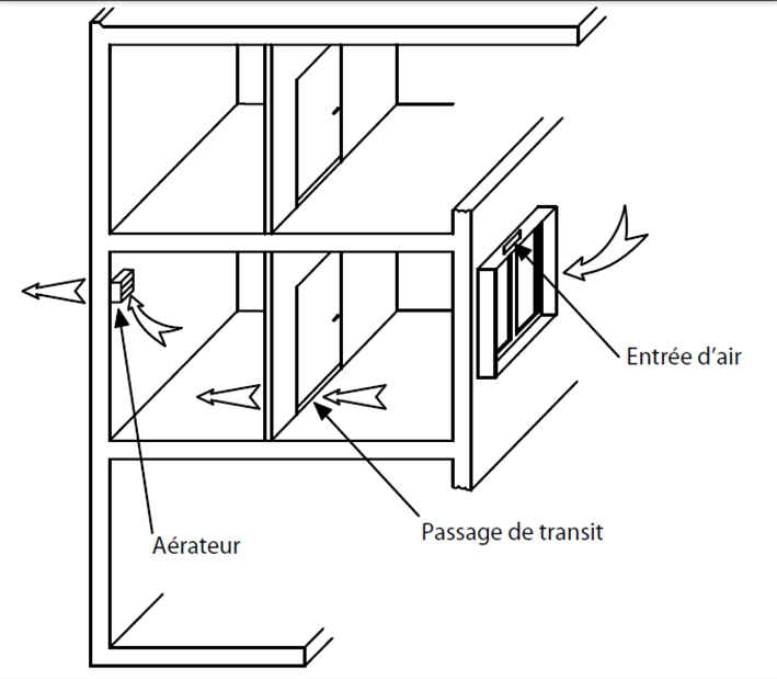 Chaque pièce de service est équipée d’un extracteur appelé aérateur et chaque pièce principale est dotée d’entrées d’air neuf. L’aérateur comporte un ventilateur qui met en dépression la pièce à traiter et rejette l’air vicié directement à l’extérieur, par le biais d’un conduit débouchant en façade ou en toiture ou directement par une traversée de paroi. Le balayage des pièces principales vers les pièces de service s’effectue grâce à des portes détalonnées (minimum 1cm) ou des grilles de transfert. La VMR impose de recourir à un minimum de deux aérateurs pour ventiler un logement, un dans la cuisine et un dans la salle d’eau. En deçà, le système de ventilation ne peut pas être considéré comme assurant une ventilation générale du logement.