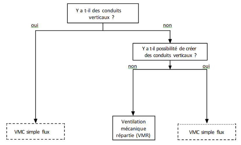 De nombreux logements à rénover ne se prêtent pas facilement à la mise en place d’une VMC. C’est bien souvent le cas des logements construits après 1958 qui disposent d’une hauteur sous plafond inférieur à 2,50m. Il est alors impossible de passer les gaines techniques dans les faux-plafonds. Le raccordement des bouches au groupe d’extraction peut être réalisé dans chaque pièce par des conduits intégrés dans des soffites. Il peut également être difficile en maison individuelle d’implanter un caisson d’extraction sous toiture ainsi qu’un réseau de conduits le reliant aux bouches d’extraction des pièces de service (salle de bains, cuisine, buanderie…). Dans un logement collectif, l’installation d’une VMC est conditionnée par la présence de conduits collectifs. Dans certains cas, l’installation d’un système de VMR peut alors s’avérer judicieuse. Si aucun conduit n’existe et qu’il n’est pas possible d’en installer pour cause d’absence de combles ou d’impossibilité de créer des faux-plafonds, une ventilation générale par un caisson d’extraction (type VMC) n’est pas réalisable. On peut alors envisager la mise en œuvre d’un système de VMR qui constitue une solution d’individualisation par pièce du système de ventilation. L’étude d’implantation d’une telle solution doit prendre en compte la hauteur sous plafond et l’esthétique extérieure du bâtiment. Dans le cas contraire, des aérateurs peuvent être placés en partie haute des murs, par exemple au-dessus des fenêtres.