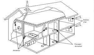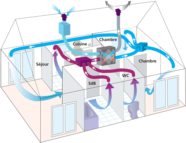 Mieux isolées, mieux chauffées et mieux ventilées, les nouvelles constructions sont plus hermétiques, ce qui peut poser des problèmes de qualité de l’air intérieur. La ventilation permet de renouveler l’air ambiant afin de préserver la santé et le confort des occupants, et d’assurer la pérennité du bâti. La RT 2012 recommande une ventilation maîtrisée et économique avec des moteurs de ventilation basse consommation pour ne pas pénaliser la consommation des postes « auxiliaires » (pompes, ventilateurs…). Dans la majorité des cas, la ventilation mécanique répartie VMR est suffisante.
