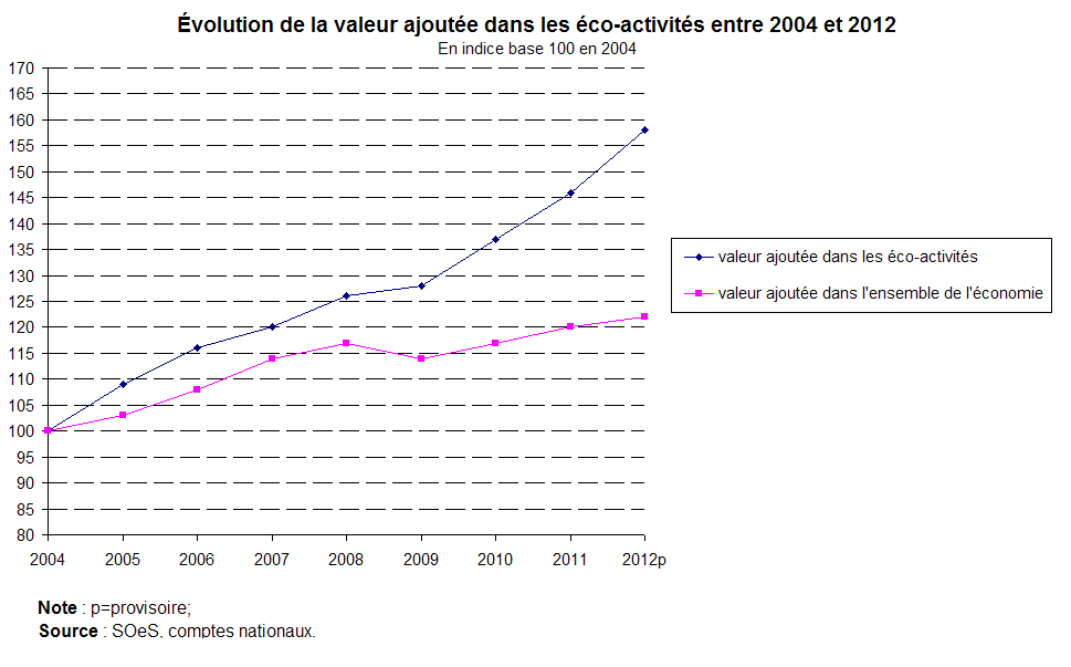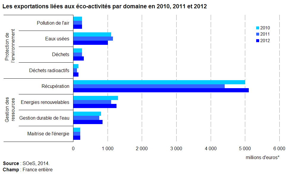 Les exportations s’élèvent à 8,5 milliards d’euros soit 1,4% du total des exportations. La balance commerciale est de 2,8 milliards d’euros, dont 2,6 milliards proviennent du domaine de la récupération. En 2013, la valeur ajoutée du secteur est estimée à plus de 31 milliards d’euros, soit 1,5% du PIB. Elle a augmenté de 1,8% en un an contre 1% dans le reste de l’économie. La valeur ajoutée dans le domaine des énergies renouvelables a progréssé de 4,7% entre 2012 et 2013. «Après les énergies renouvelables, les domaines des eaux usées et de la réhabilitation des sols et eaux ont le plus fortement augmenté en valeur (+ 160 millions d’euros, soit + 2,1 %). La hausse de la valeur ajoutée dans les eaux usées (+ 2,1 %) est principalement portée par les entreprises privées pour le captage et la distribution d’eau ou la collecte et le traitement des eaux usées. Concernant le domaine de la réhabilitation des sols et eaux, les activités de dépollution et nettoyage des sols et eaux souterraines et celles de dépollution des bâtiments et des usines (hors domaine du nucléaire) augmentent également de 2,1 %. » La production écoulée ou destinée à être écoulée sur le marché comprend, « les produits vendus à un prix économiquement significatif ; les produits troqués ; les produits utilisés pour effectuer des paiements en nature, y compris les rémunérations des salariés en nature ; les produits livrés par une unité d’activité économique locale à une autre unité d’activité économique locale appartenant à la même unité institutionnelle et destinés à être utilisés par cette dernière pour sa consommation intermédiaire ; les produits ajoutés aux stocks de biens finis et de travaux en cours, destinés à une ou plusieurs des utilisations précédentes. »
