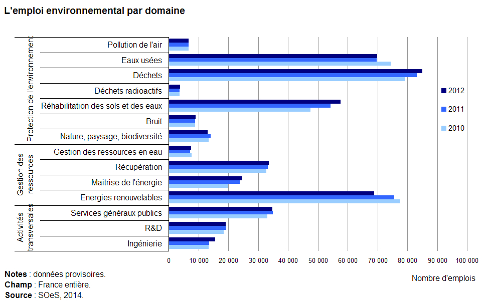 Aujourd’hui, en termes d’effectifs les domaines les plus importants sont ceux des déchets, des eaux usées et des énergies renouvelables. Les éco activités emploient 442 400 personnes en 2013. Entre 2012 et 2013, les effectifs ont diminués de -0,3% contre -0,2% dans le reste de l’économie. Cela s’explique par la baisse de l’emploi dans les énergies renouvelables, la croissance des effectifs dans la réhabilitation des sols et eaux a atténué la baisse globale. En effet, c’est le domaine sur le quel on constant la plus forte croissance en 2013 et est le plus performant en termes de croissance des effectifs sur ces neufs dernières années. « Les activités de protection de l’environnement comptent plus de la moitié des emplois environnementaux (244 300). La gestion des ressources naturelles (134 100) et les activités transversales (69 100) se partagent la moitié des emplois restants.