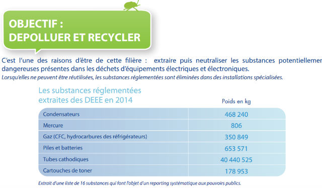 Ces progrès viennent notamment de la dépollution des gros appareils électroménagers froids, enjeu important du développement durable : ces machines peuvent contenir des substances extrêmement nocives, comme les gaz CFC (chlorofluorocarbure), particulièrement dangereux pour la couche d’ozone et ayant un fort impact sur le réchauffement climatique. Ces gaz peuvent en effet être 11 000 fois plus dangereux que le CO2 lui-même ! S’ils sont aujourd’hui interdits, ils ont longtemps été utilisés dans des appareils comme les climatiseurs ou les réfrigérateurs : le recyclage de ces anciens produits peut donc permettre de capturer l’équivalent de 3 tonnes de CO2. Recyclés, ces anciens appareils peuvent devenir une véritable mine de matières premières secondaires, et leur réutilisation semble être une source certaine d’énergie. En 2014, plus de 360 000 appareils ont ainsi été confiés aux 69 centres de traitement Eco-systèmes, pour être valorisés à 78,7% sous forme de matières premières et à 9,4% sous forme d’énergie. Ces modèles de recyclage économiques et écologiques sont donc fortement soutenus par la filière Eco-systèmes, qui a ainsi versé 27 millions d’euros à ses partenaires de l’économie sociale et solidaire entre 2010 et 2014.