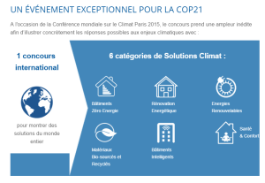 Du 30 novembre au 11 décembre 2015, Paris accueillera la 21ème conférence des Nations Unies sur les changements climatiques : l’opportunité pour le pays de montrer ses nombreux investissements en faveur du développement durable. La transition énergétique des bâtiments étant devenue un enjeu primordial des problématiques liées au climat, le concours Green Buildings Solutions Awards offre une vitrine de choix pour les professionnels du secteur. Depuis le début du concours, le 18 mai dernier, ils ont en effet la possibilité d’exposer leurs solutions concrètes pour le développement des bâtiments intelligents. Jusqu’à la cérémonie de fermeture de l’événement à Paris, pendant la COP21, les réalisations en compétition seront identifiées « Solutions Climat ». A ce titre, durant les six mois de la compétition, les solutions et leurs investisseurs bénéficieront d’une véritable couverture médiatique : présents sur les lieux de rencontre de la COP21, sur le web et sur les réseaux sociaux, leur visibilité sera considérable.