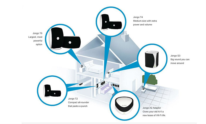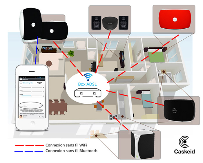 Tous les produits Caskeid de Jongo sont connectés à la box ADSL par une liaison sans fil Wi-Fi. Les appareils Bluetooth comme un smartphone ou une tablette se connectent à une seule des enceintes Jongo, représentée sur le schéma par la connexion bleue.