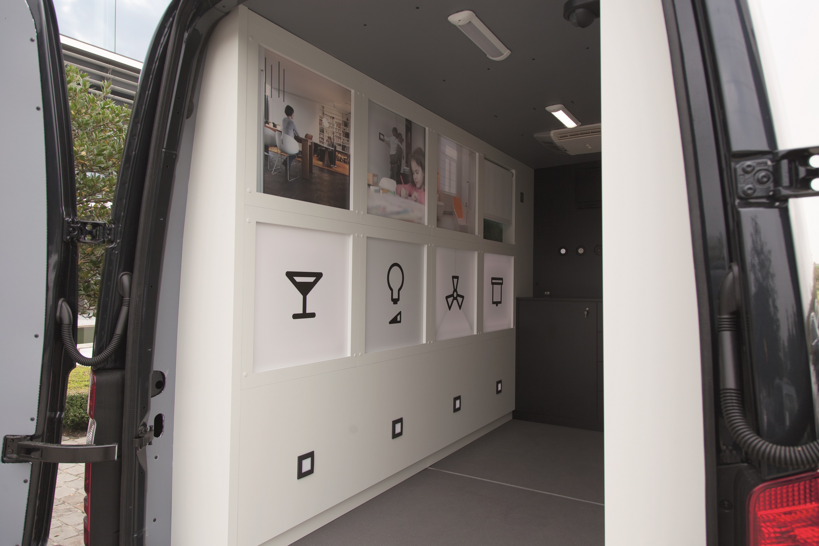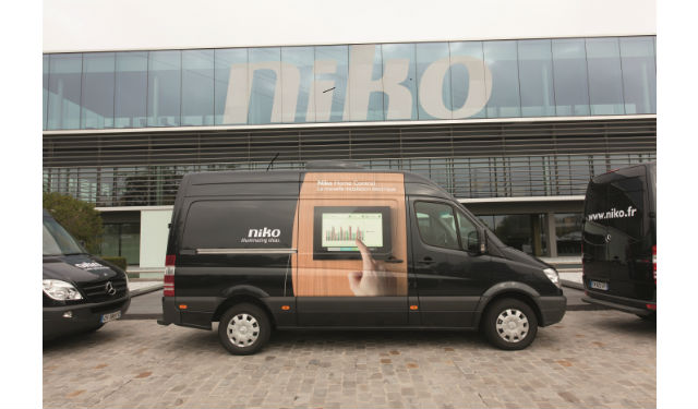 Pour montrer aux installateurs et à leurs clients comment fonctionne Niko Home Control et tout ce qu’ils peuvent faire avec, Niko vient à leur rencontre avec un show-room mobile. Dans une camionnette leur est présentée une installation entièrement fonctionnelle incluant tout : du coffret de distribution avec l’ensemble des modules à l’écran tactile en passant par le poste extérieur vidéo et les thermostats. Sans oublier les différents éléments de finition Niko, qui peuvent être touchés et manipulés afin de finaliser son choix de couleur et de matériau. Quatre camionnettes sillonnent ainsi la France en Rhône-Alpes, PACA, Ile de France et depuis le printemps en Midi-Pyrénées.
