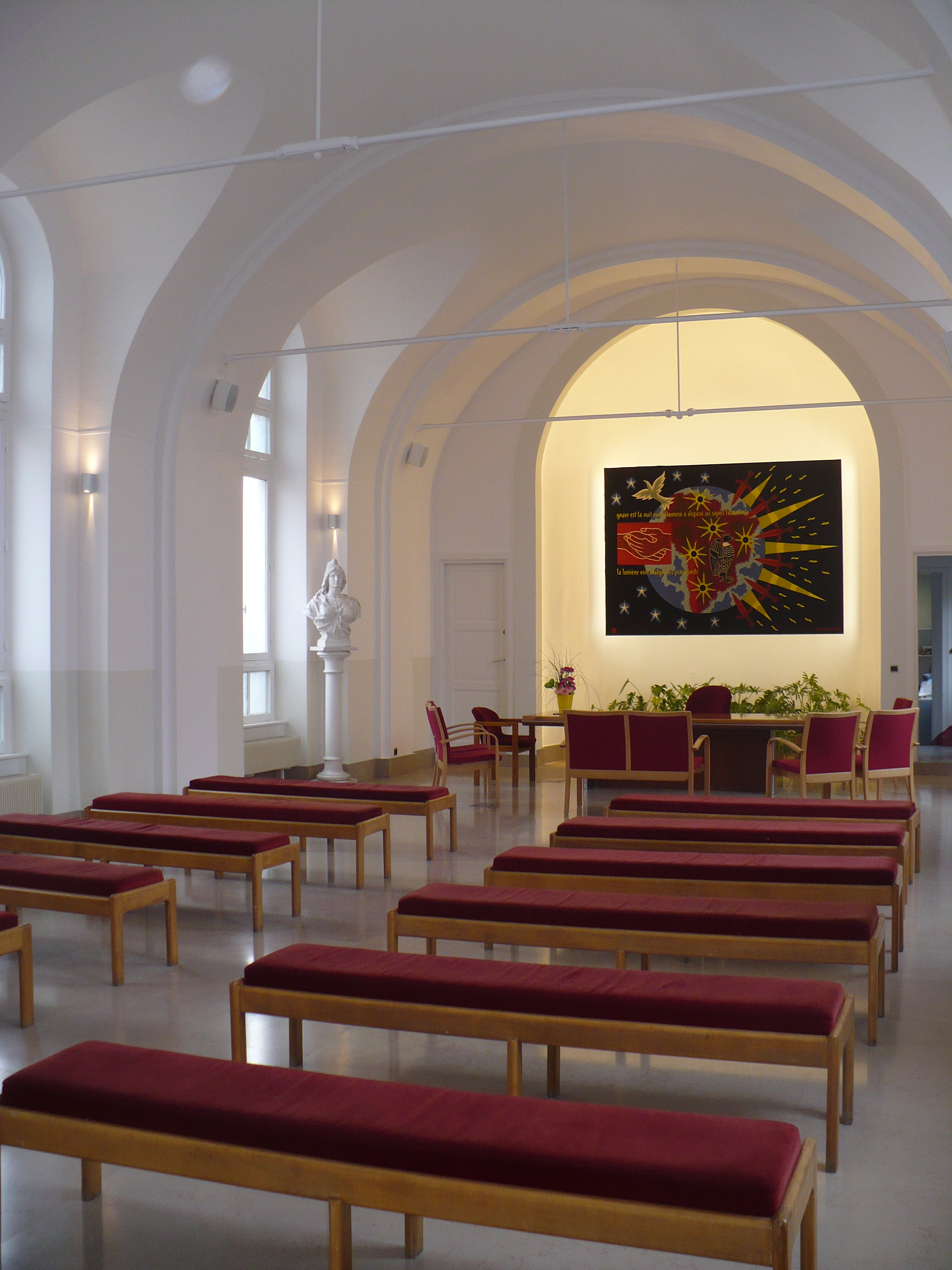 L’alcôve en fond de salle qui réserve un écrin naturel à la tapisserie. Ainsi mise en valeur par la rénovation du revêtement mural arrière de couleur blanche, et de l’encadrement ton sur ton, l’œuvre est mise en valeur selon deux principes : le premier par un éclairage direct dissimulé à l’arrière de la voûte, comme illuminé par la lumière du jour, le second par un éclairage indirect, installé à l’arrière de la toile, sur la structure métallique lui servant de support, dans une température de couleur plus chaude ; les deux plans sont traités par des rubans led Rubilight 8W/m graduables de On Off. La tapisserie donnera l’effet d’être comme suspendue à l’arrière de l’officier d’Etat civil.