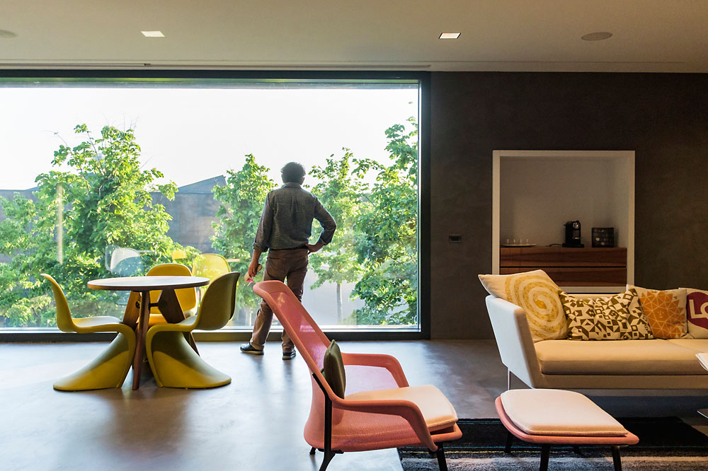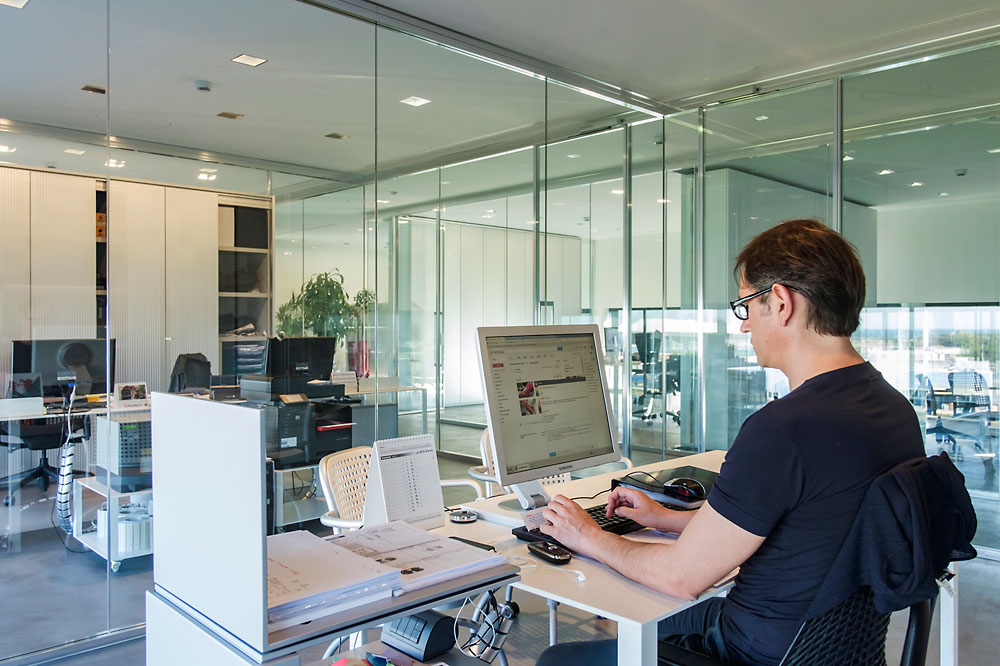 La variante carrée des appareils d’éclairage a été retenue à Le Silla pour s’harmoniser au mieux avec l’architecture du bâtiment et obtenir un design de plafond sobre. Le résultat est un éclairage très cohérent sur le plan formel, mais aussi très discret, avec des faisceaux croisés, précis et rectilignes, sans aucun compromis sur la qualité de la lumière. Du fait des grandes surfaces vitrées et de la quantité de lumière naturelle qui pénètre dans les bureaux de Le Silla, la coordination précise entre la lumière du jour et la lumière artificielle est essentielle. Une fois de plus, ERCO impressionne avec sa technique d’éclairage de grande qualité, qui permet une gradation continue jusqu’à 1%. La lumière en blanc chaud (3 000 K) crée une atmosphère naturelle et conviviale, séduit par son caractère brillant et répond aux exigences les plus strictes en matière de rendu naturel des couleurs – fournissant ainsi des conditions idéales pour le travail créatif réalisé ici chaque jour par Enio Silla et son équipe.