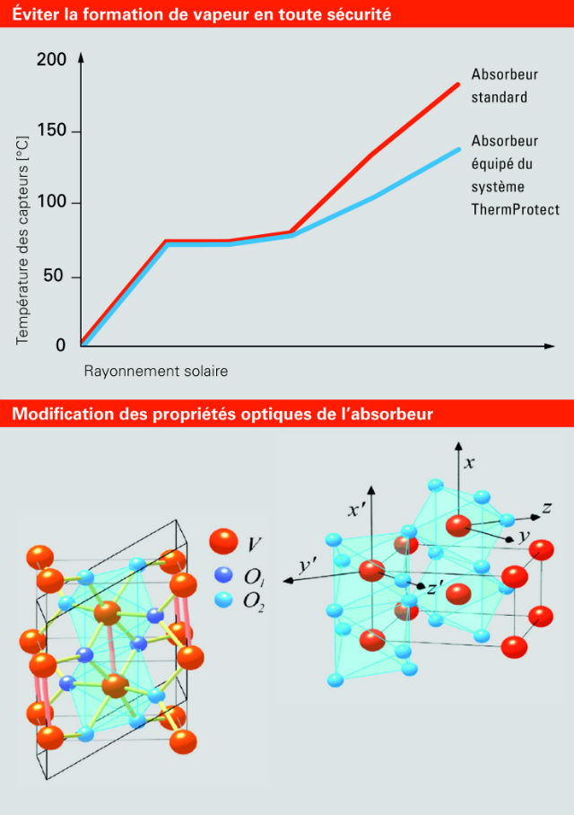 Le revêtement intelligent de l’absorbeur évite aux capteurs de monter à des températures trop élevées. La technique ThermProtect brevetée Viessmann a été développée pour ses propriétés de commutation à une température précise : au-dessus de 75 °C, la structure cristalline du revêtement se modifie. Il en résulte une augmentation progressive de son émissivité infrarouge et une réduction de la puissance du capteur. La limitation de température du capteur évite les phases vapeur dans le circuit solaire. Par effet inverse, lorsque la température du capteur chute, la structure cristalline reprend sa forme initiale, un peu à l’image des lunettes de soleil à changement de teinte. Plus de 95 % du rayonnement sont absorbés et convertis en chaleur !