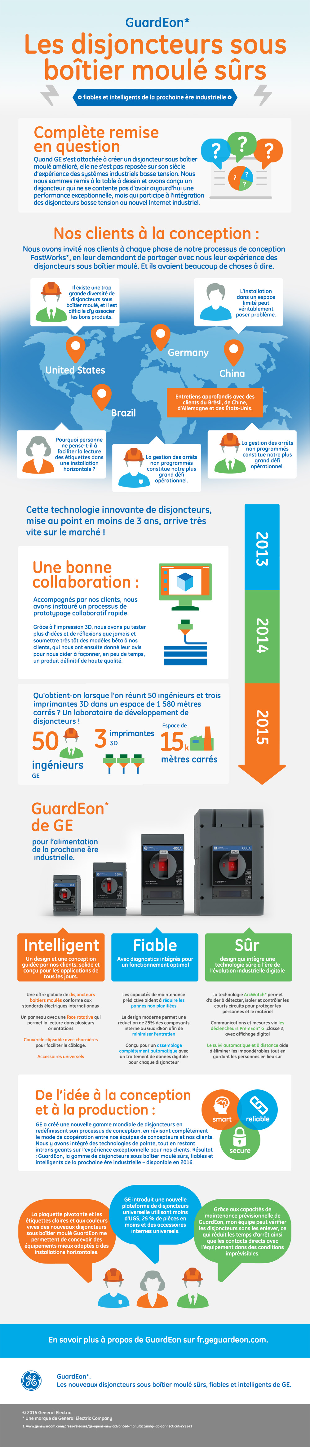 · Un design solide et intuitif : Dans le cadre de son processus de conception itérative, GE a travaillé pendant deux années en étroite collaboration avec plus de 100 clients issus de 17 pays de sorte à recueillir leur sentiment à toutes les phases de la conception, des tout premiers dessins originaux aux derniers prototypes réalisés. Les retours d’expérience des clients ont permis d’apporter à GuardEon bon nombre d’améliorations simples, mais utiles, notamment sa plaque frontale rotative, sa poignée tournante ergonomique et son design épuré de certains composants que l’on trouvait dans les précédents disjoncteurs à boîtier moulé fabriqués par GE. Grâce au GE Store, l’équipe de développement de GuardEon a pu mettre à profit l’expérience de l’entreprise dans les domaines du pétrole et du gaz, des industries extractives et navale, des datacenters et dans d’autres secteurs industriels pour aboutir à un design optimal et améliorer les fonctionnalités proposées aux clients.