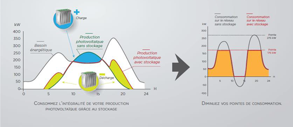 La durée de vie de la batterie est peu affectée par l’usage car les cycles de charge/décharge gérés par le BMS (Battery Management System) ne sont jamais complets, la batterie n’est ainsi jamais déchargée complètement. La puissance fournie par les batteries a une variation douce dans le temps. La durée de vie du stockage est prévue pour 12 ans (avec un changement de batterie vers 5/6 ans pour les plus usagées).