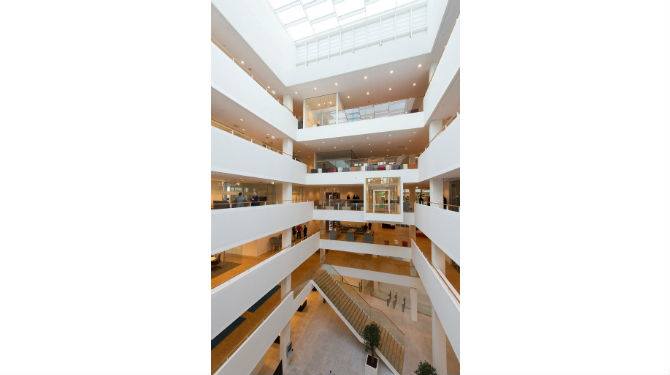 La façade et le toit du bâtiment sont réalisés en verre : ceci facilite le recours à la technologie d’exploitation de la lumière du jour. Des capteurs mesurent les niveaux d’ensoleillement naturel et de présence dans le bâtiment et le système régule les commandes d’éclairage et des volets en conséquence. En utilisant la chaleur et la lumière du soleil et en réglant les stores, il est possible de réaliser des économies d’énergie tout en garantissant le confort des employés. Des études ont montré que les économies réalisables sur la consommation d’énergie liée à l’éclairage peut être comprises entre 20 et 60 % – l’éclairage représente 30 % de la consommation d’énergie d’un bâtiment.