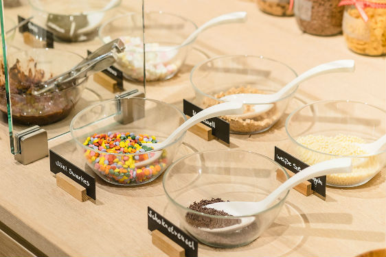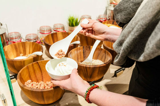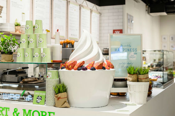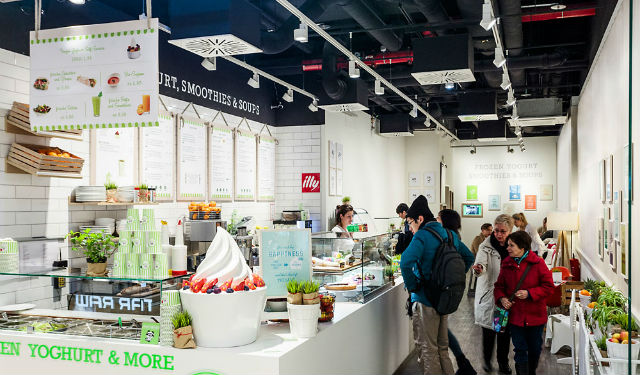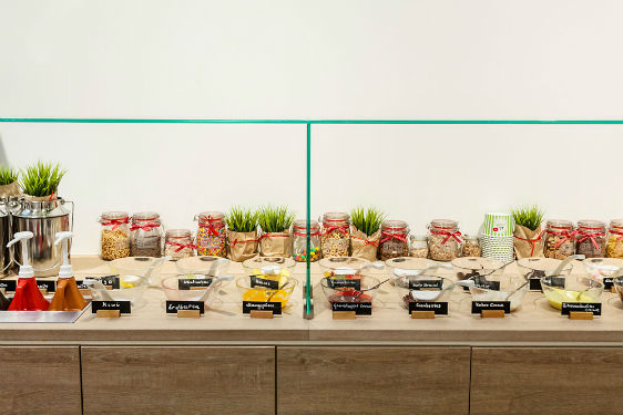 Avec leur boutique Youfresh dans le nouveau « Mall of Berlin » sur la Leipziger Platz, Margaretha et Jan Olszewski démontrent que la restauration rapide peut être aussi fraîche, saine et délicieuse. Au menu, soupes, salades et sandwiches – également des variantes véganes –, boissons, smoothies et yaourts glacés. Hormis les soupes, tous les plats sont préparés sur place et sur commande ; le client peut également préparer lui-même ses propres favoris à un bar à salades et les agrémenter – selon la saison et l’offre du jour – de toppings sains. Le yaourt glacé au lait bio, confectionné sur place, s’adapte à tous les goûts avec des fruits, du muesli, des sauces ou des friandises sucrées. Près d’une cinquantaine de toppings différents sont disposés sur un présentoir spécial, le long de la paroi latérale, à l’arrière de la boutique en face des tables. Le vert mai frais et le blanc dominent le local étroit, tout en longueur et de tout juste 90 mètres carrés conçu à la base par les spécialistes en aménagement intérieur de l’agence Ippolito Fleitz Group de Stuttgart et Berlin. Le principal élément d’architecture intérieure est un long comptoir blanc en Corian en forme de L dont le petit côté – décoré avec des fruits, des herbes et une réplique XXL d’un yaourt glacé – s’avance visuellement dans le Mall pour attirer les visiteurs qui flânent. « Le comptoir simule le mouvement vers le fond du local », explique Michael Bertram, responsable de la conception d’Ippolito Fleitz Group. « Il regroupe également de nombreuses fonctions et éléments de restauration – compartiments réfrigérés, distributeurs de boissons, bacs à salades et, bien sûr, l’espace caisse. » Les architectes d’intérieur ont également défini des emplacements précis pour toutes les fonctions. « Cela laisse au gérant une grande liberté dans la mise en scène des décorations changeantes et dans son propre marchandisage », selon le concepteur.