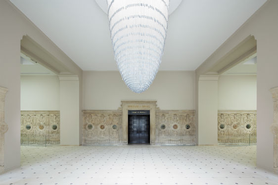 3 000 brins de fibre optique éclairante sont suspendus pour ce lustre monumental. D’une hauteur de 3 m et d’un diamètre de 1,80 m, il trône lumineusement au centre du vestibule de la Bibliothèque nationale de France Richelieu.