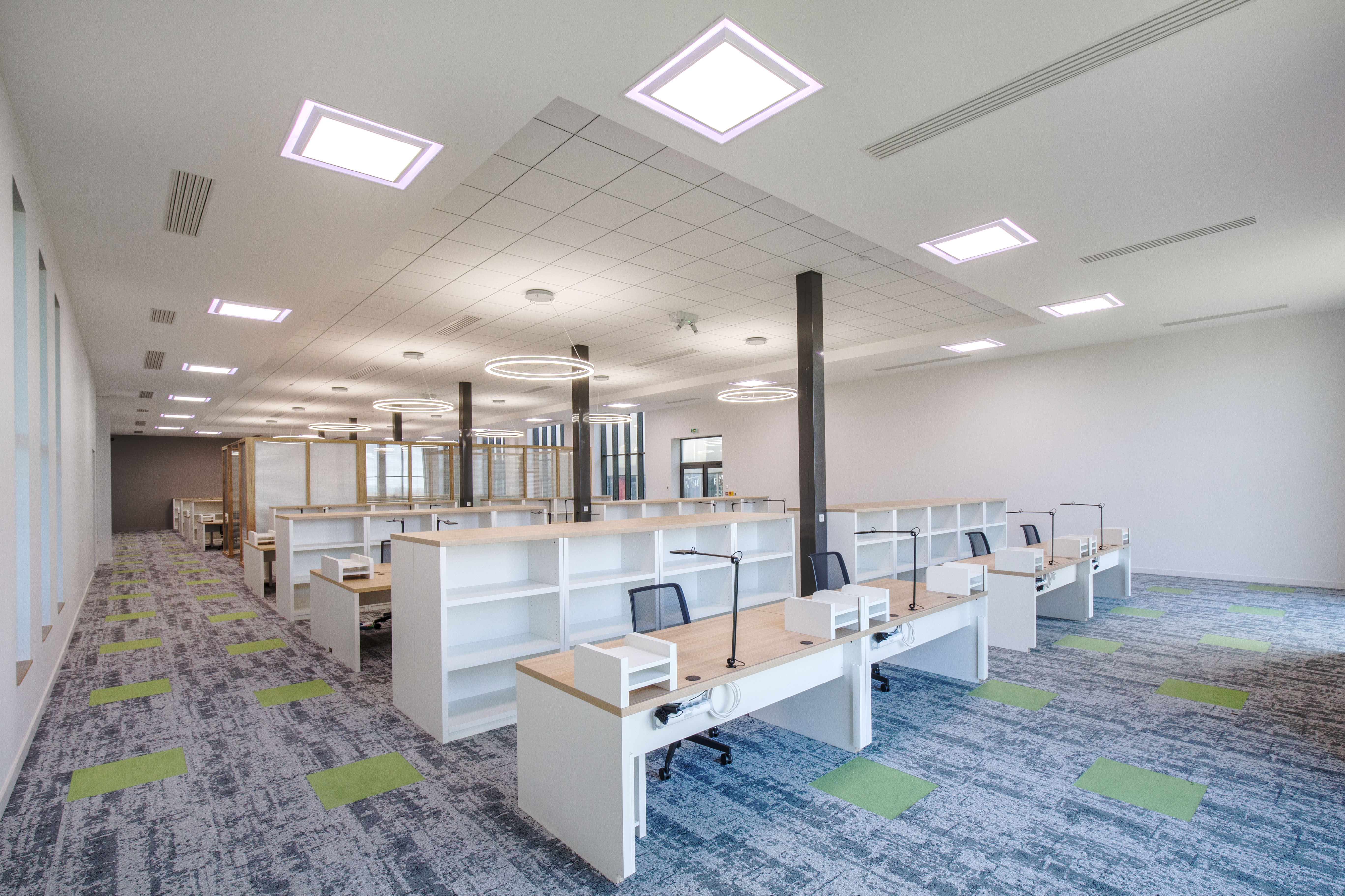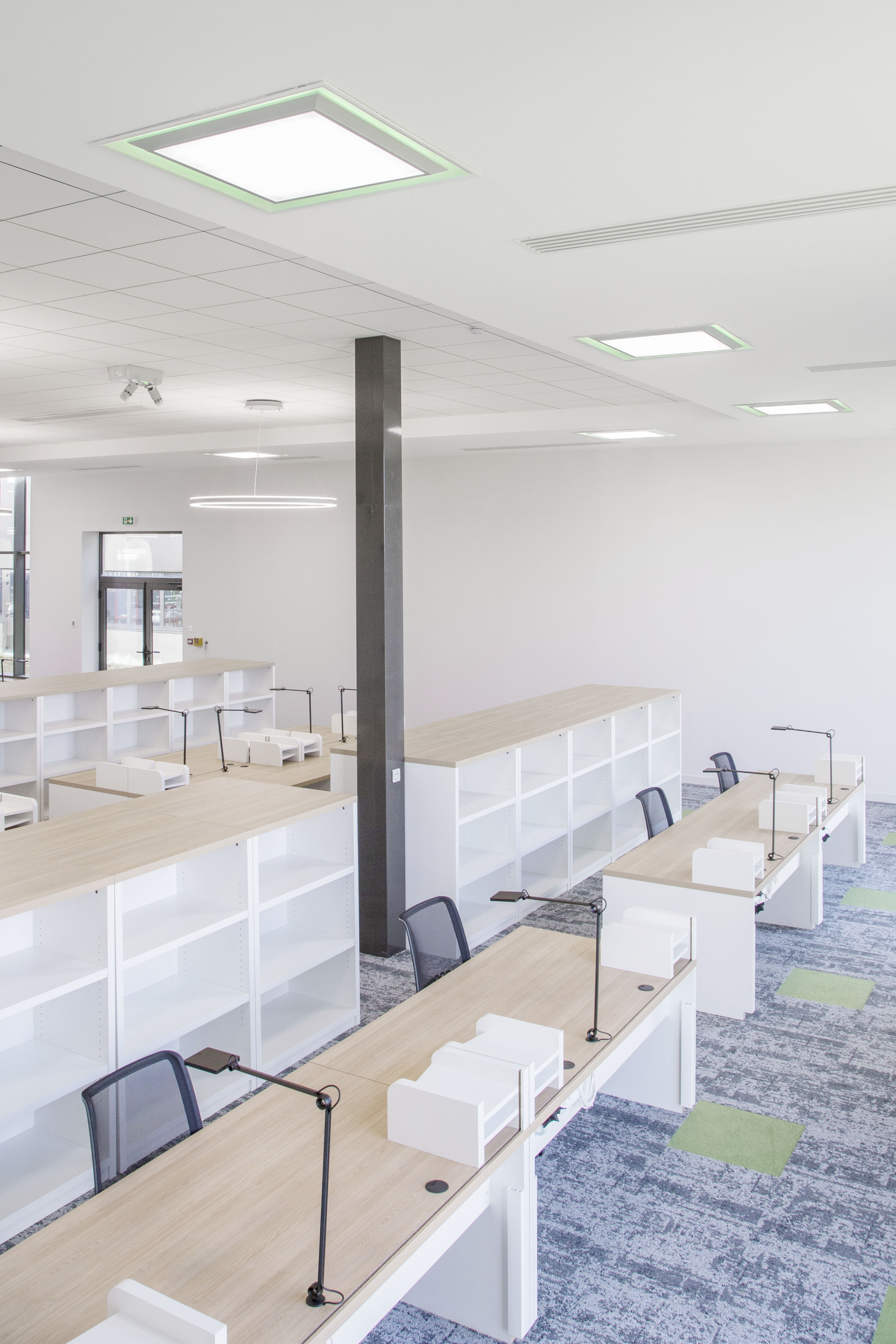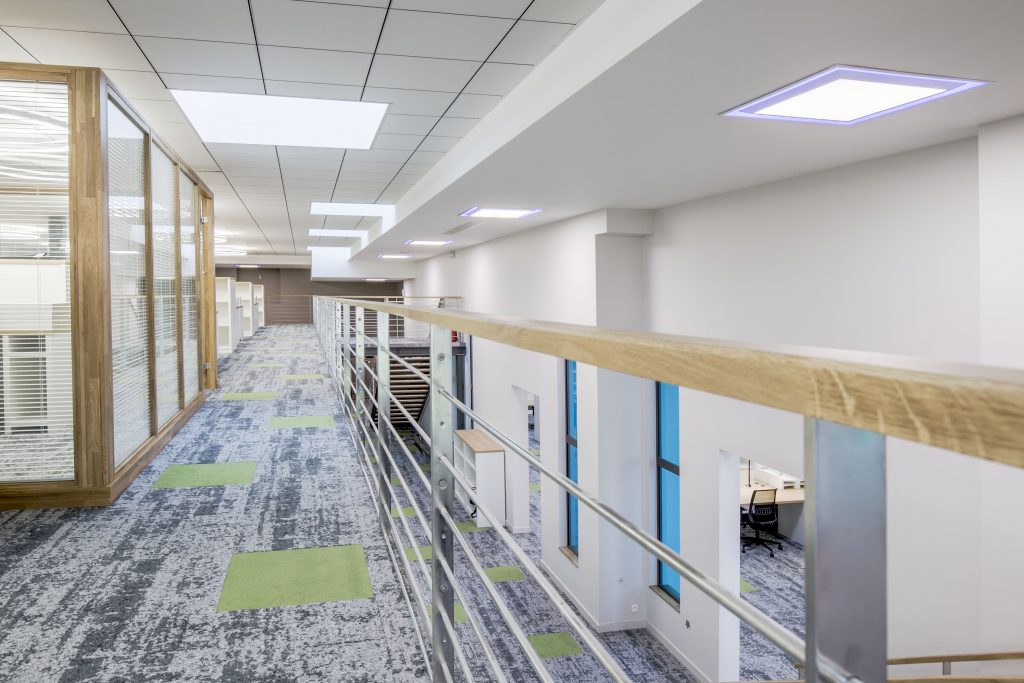 Under the mezzanine floor, in the workspace, Ixapack opted for RZB’s Pascala Round LED embedded downlights (UGR: 17), with aluminium reflectors, that creates a light reflexion of up to 98 %. These downlights have a temperature of 4 000 K, a luminous flux of 2 050 lm, a power output of 20 W and a colour rendering index of 80. Upstairs, the workspace, as well as part of the corridor, are illuminated by Planlicht’s Halo luminaires. Within the workspace, each desk is lit by Waldmann’s Para.Mi lamps.