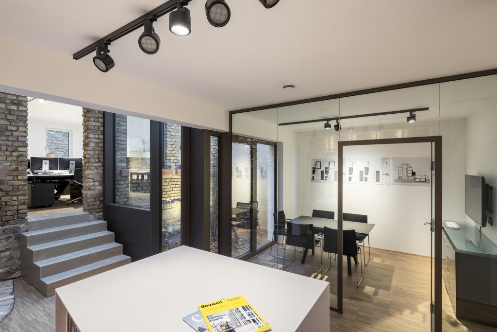 L’attention de toute personne passant devant le nouvel immeuble de Faerber Architekten dans la Weißgasse de Mayence est attirée sur l’agence d’architecture grâce à un point d’attraction mis en valeur par un éclairage accentué : derrière la façade vitrée de l’entrée, une maquette architecturale de couleur blanc neige, représentant un projet emblématique actuel de l’agence et reposant sur un comptoir laqué noir, est mise en scène de manière spectaculaire par un projecteur Parscan de 7 W avec répartition de lumière narrow spot. « Cette maquette fait office de carte de visite de l’agence, explique Fabian Faerber. Alors que la façade du bâtiment est plutôt sobre, l’observateur qui s’arrête devant l’entrée découvre un bureau qui est, lui, imposant en raison de sa remarquable profondeur, qui s’étend jusqu’à l’ancien bâtiment de l’arrière-cour. » La lumière d’accentuation produit non seulement des hiérarchies de perception, mais crée aussi des relations visuelles entre l’intérieur et l’extérieur.