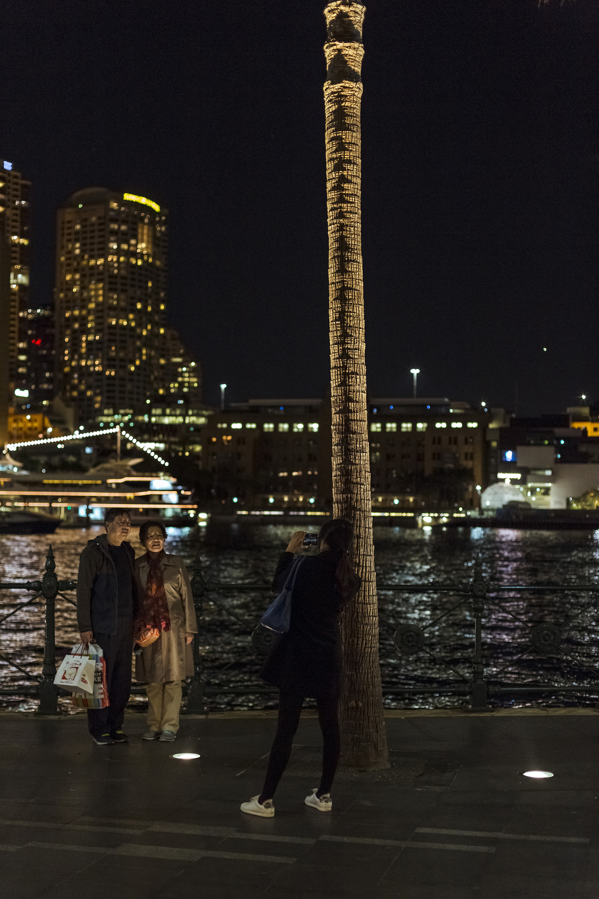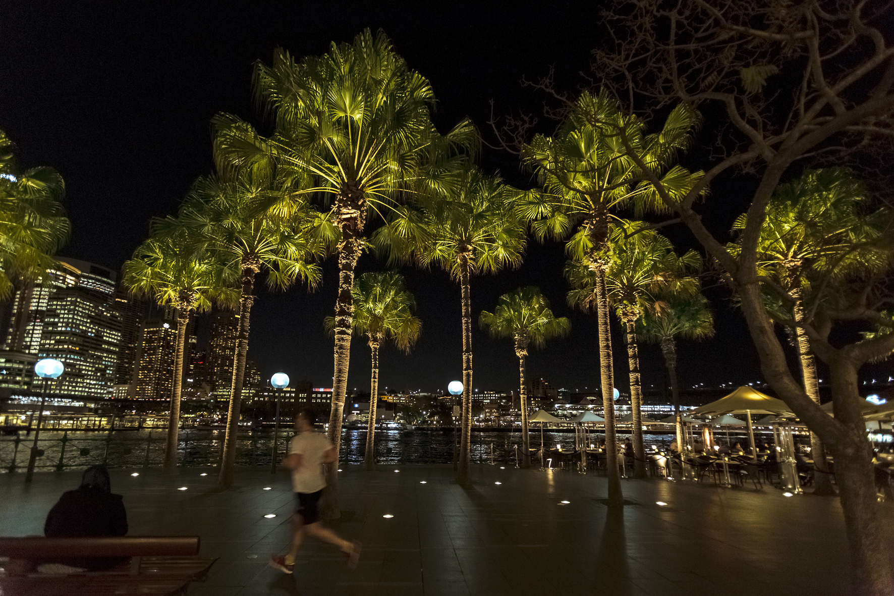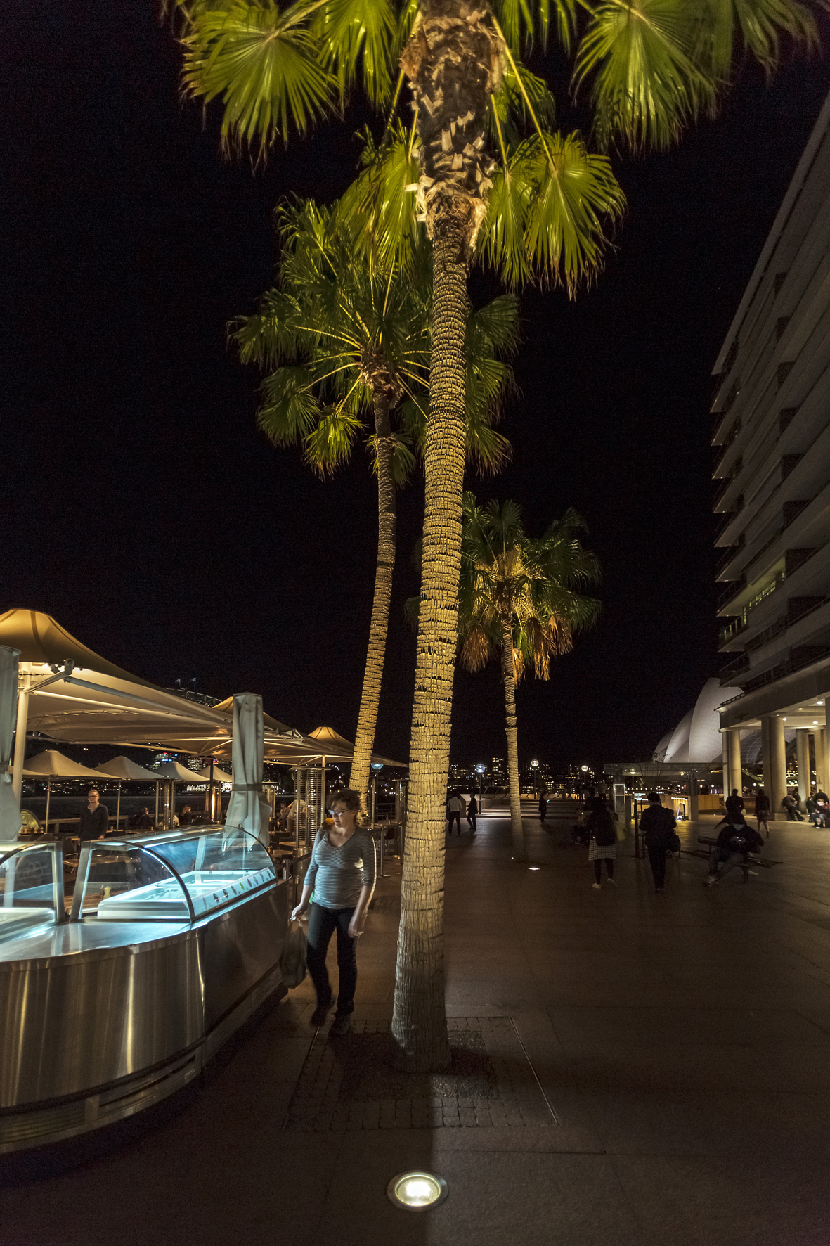 Ils étaient encore tout récemment éclairés par des lampes aux halogénures métalliques d’une puissance de 35 W. La ville de Sydney s’est entre-temps reconvertie à la technologie LED en matière d’éclairage. Les palmiers sont maintenant mis en scène par des encastrés de sol Tesis ERCO d’une puissance de 15 W. Deux spots avec une couleur de lumière de 3 000 K sont dirigés vers chaque palmier. Orienté avec une précision extrême, l’éclairage souligne non seulement la forme des palmiers, mais met aussi en valeur les délicates structures et nuances chromatiques des troncs et du feuillage. Il en résulte une impression presque surréelle qui devrait rendre le Circular Quay encore plus attrayant pour des flâneurs nocturnes.