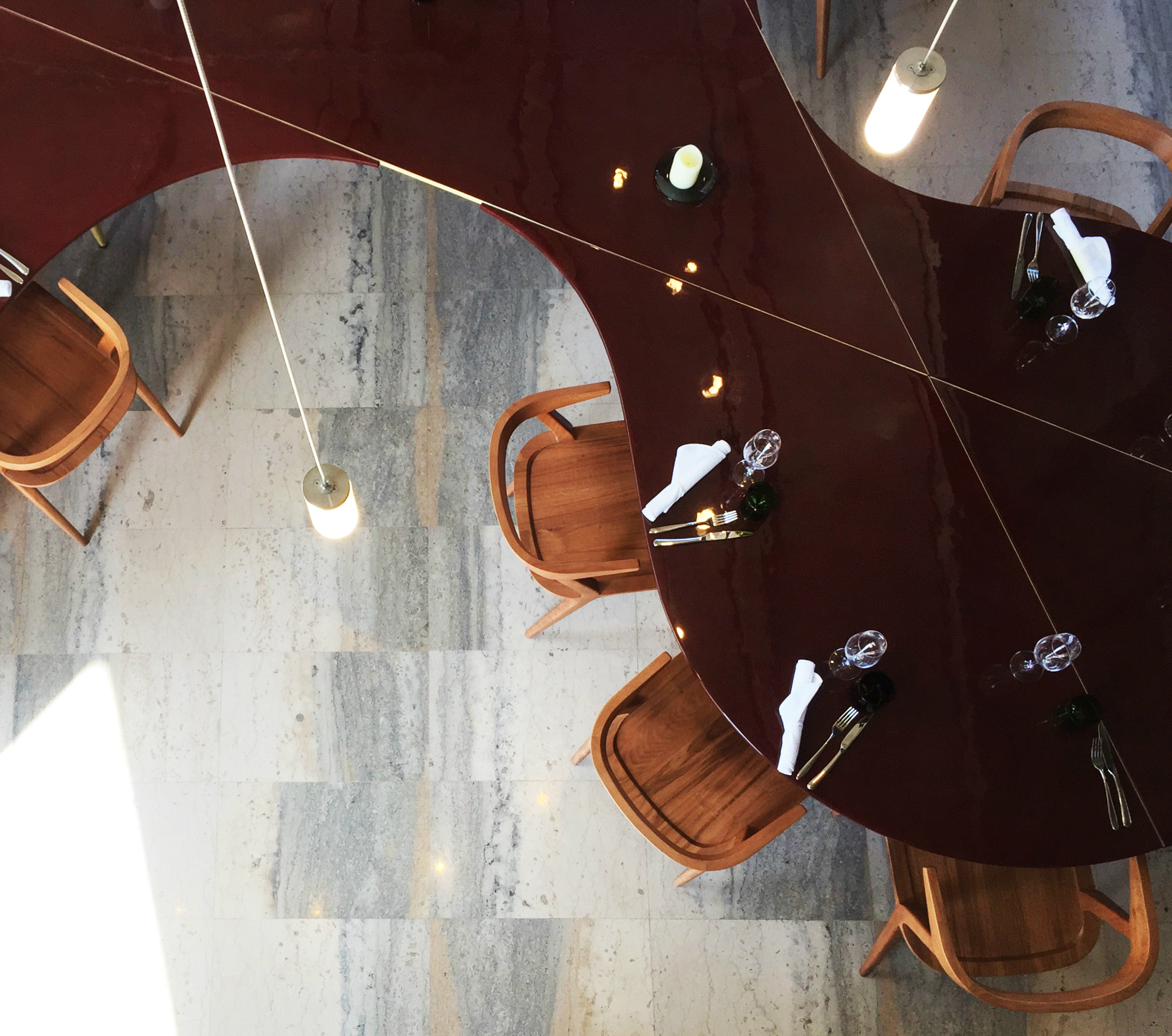 « La nappe de points lumineux suspendue dans la salle principale crée un plafond artificiel, décrit le concepteur lumière Hervé Audibert. Selon le plan axonométrique, elle donne une autre lecture de la hauteur aux clients du restaurant. »