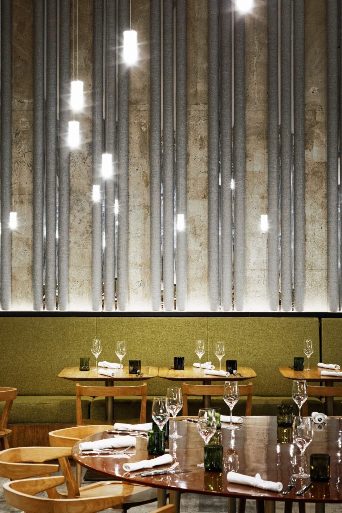 Maître du lieu, l’espace central « Les Grands Verres » comporte un bar de 18 mètres de long en terre compactée, un matériau 100 % naturel et durable. L’implantation minutieuse de 316 suspensions lumineuses fixées à des structures tubulaires magnifie le restaurant du Palais de Tokyo.