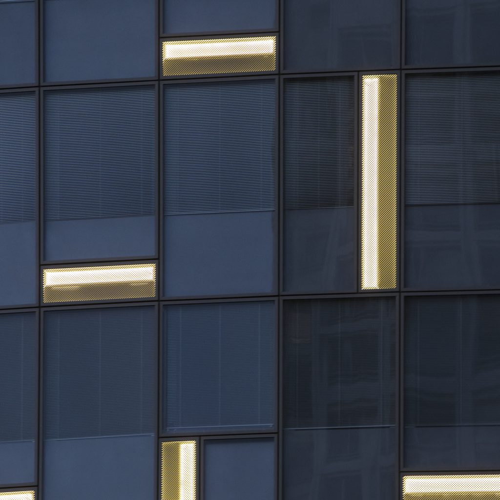 D’après les architectes, la composition est librement inspirée de peintres tels que François Morellet, Piet Mondrian ou Lucio Fontana. Les luminaires sur mesure éclairent la moitié d’un caisson de façade. La différence de luminosité entre les deux moitiés donne une impression de relief. La face avant est réalisée avec une tôle perforée ton laiton.