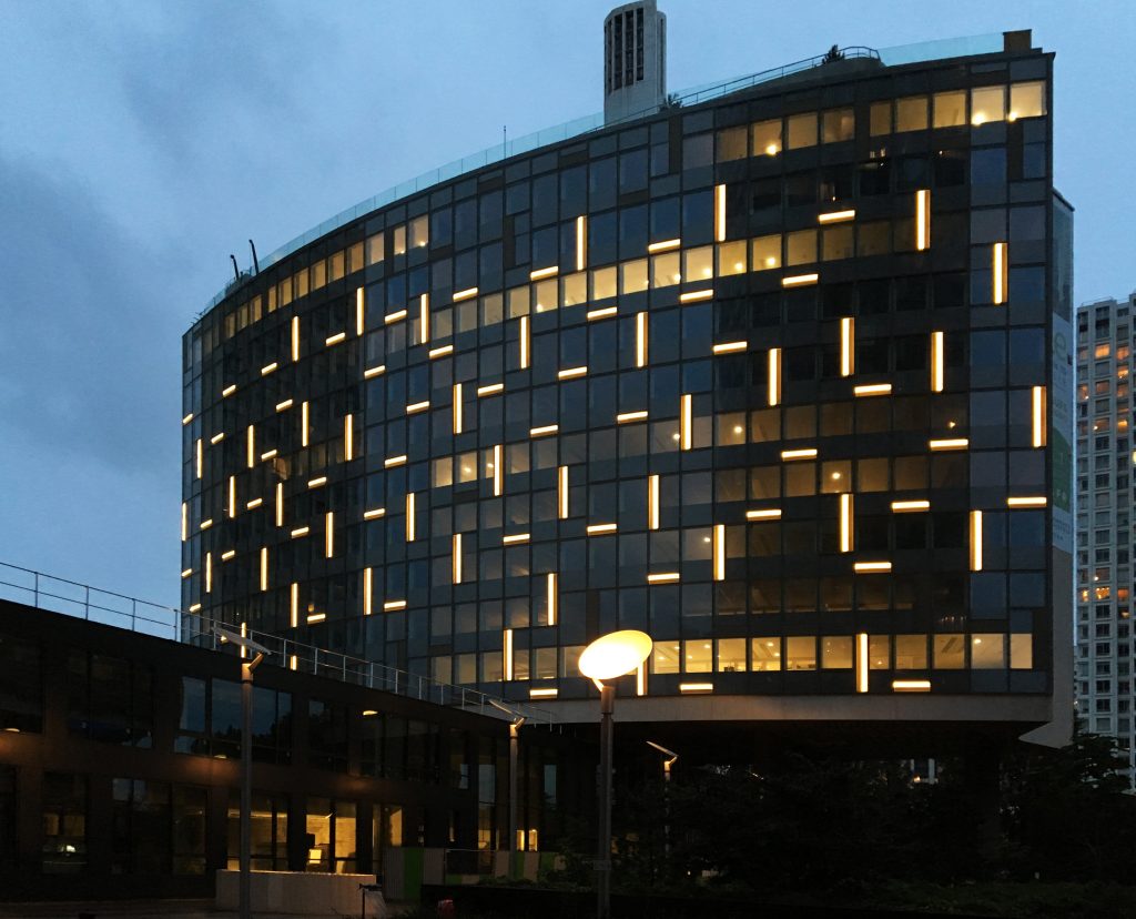 Sur la dalle du front de Seine, la tour Greenelle est un immeuble de bureaux atypique à Paris. Il se développe sur 12 étages et deux façades convexes, identiques et sud-nord. Depuis sa rénovation par les architectes de l’Atelier Castro Denissof et Associés, une façade luminescente crée une nouvelle trame de lumière. Un éclairage LED intégré au bâtiment.