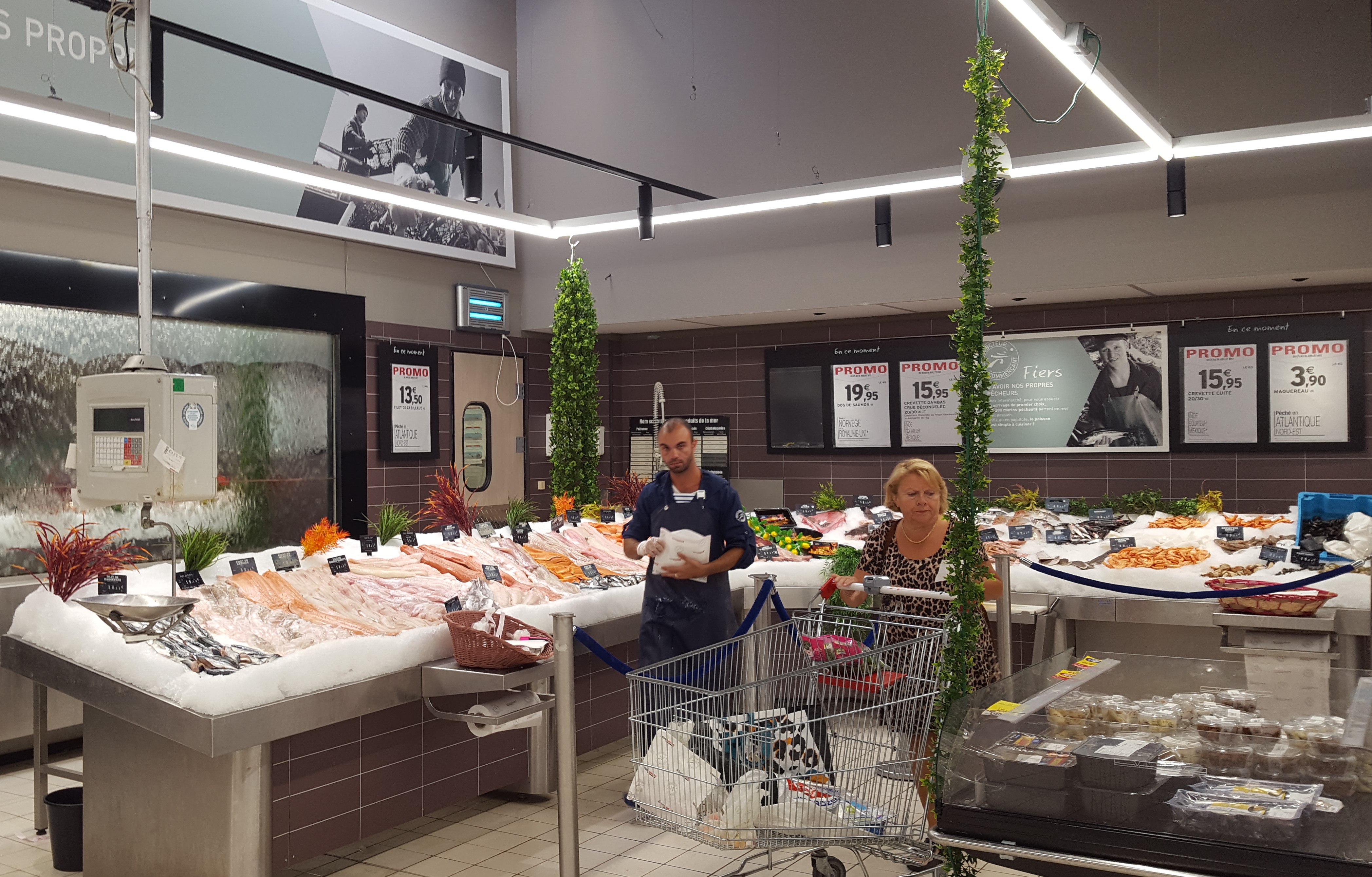 Pour le maître d’ouvrage, la question de l’éclairage est essentielle que ce soit pour le confort des clients comme pour le développement du magasin. De plus, le directeur connaît les avantages que représente la technologie LED en termes d’économie d’énergie et de mise en valeur des produits. Il souhaite vivement remplacer les appareils existants obsolètes par des luminaires efficaces de dernière génération. « J’avais une idée de ce que je voulais, notamment un éclairage en quadrillage et non une disposition en lignes parallèles qui sillonnent la zone de vente, comme ce qui existait. Des collègues m’avaient expliqué que ce système évitait les zones d’ombre qui nuisent à la perception des produits. » Rappelons que dans un supermarché, les produits peuvent être disposés sur des étagères, dans des meubles réfrigérés, en tête de gondole, etc. La façon d’éclairer va différer selon leur présentation (sur des rayons, dans des meubles réfrigérés, sur un étal, etc.) et selon leur aspect : viandes, poissons, viennoiseries, fruits et légumes, textiles, produits d’hygiène ne se mettent pas forcé-ment en valeur de la même façon.