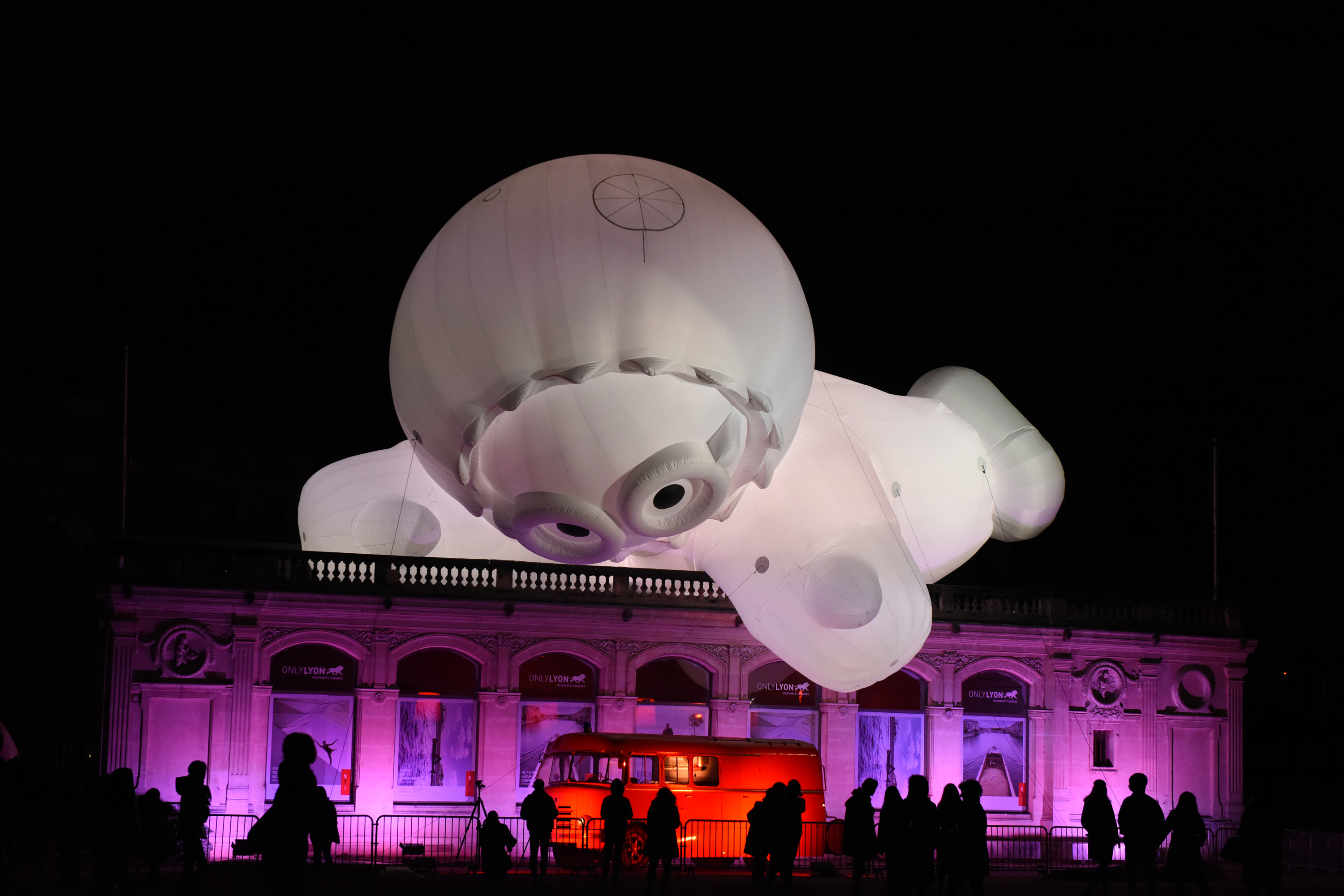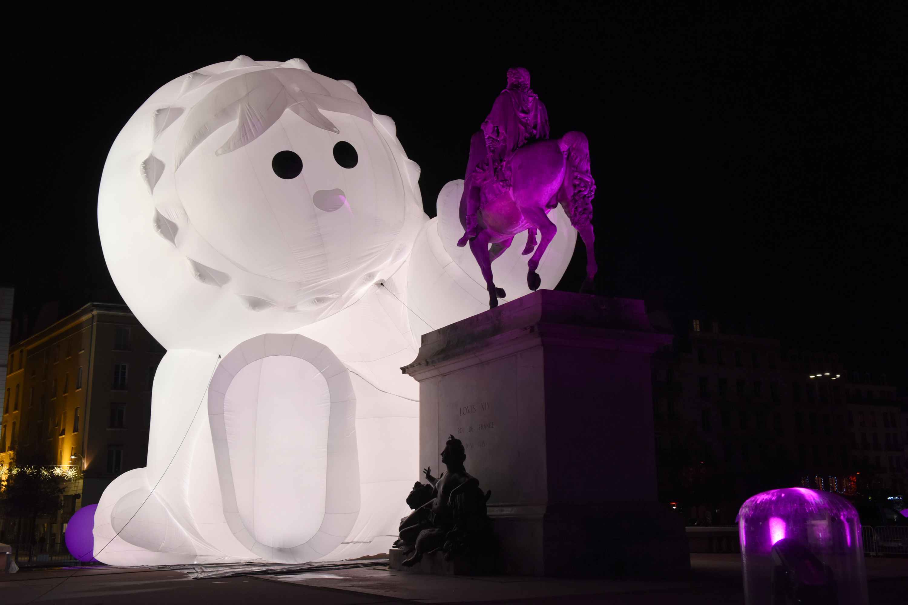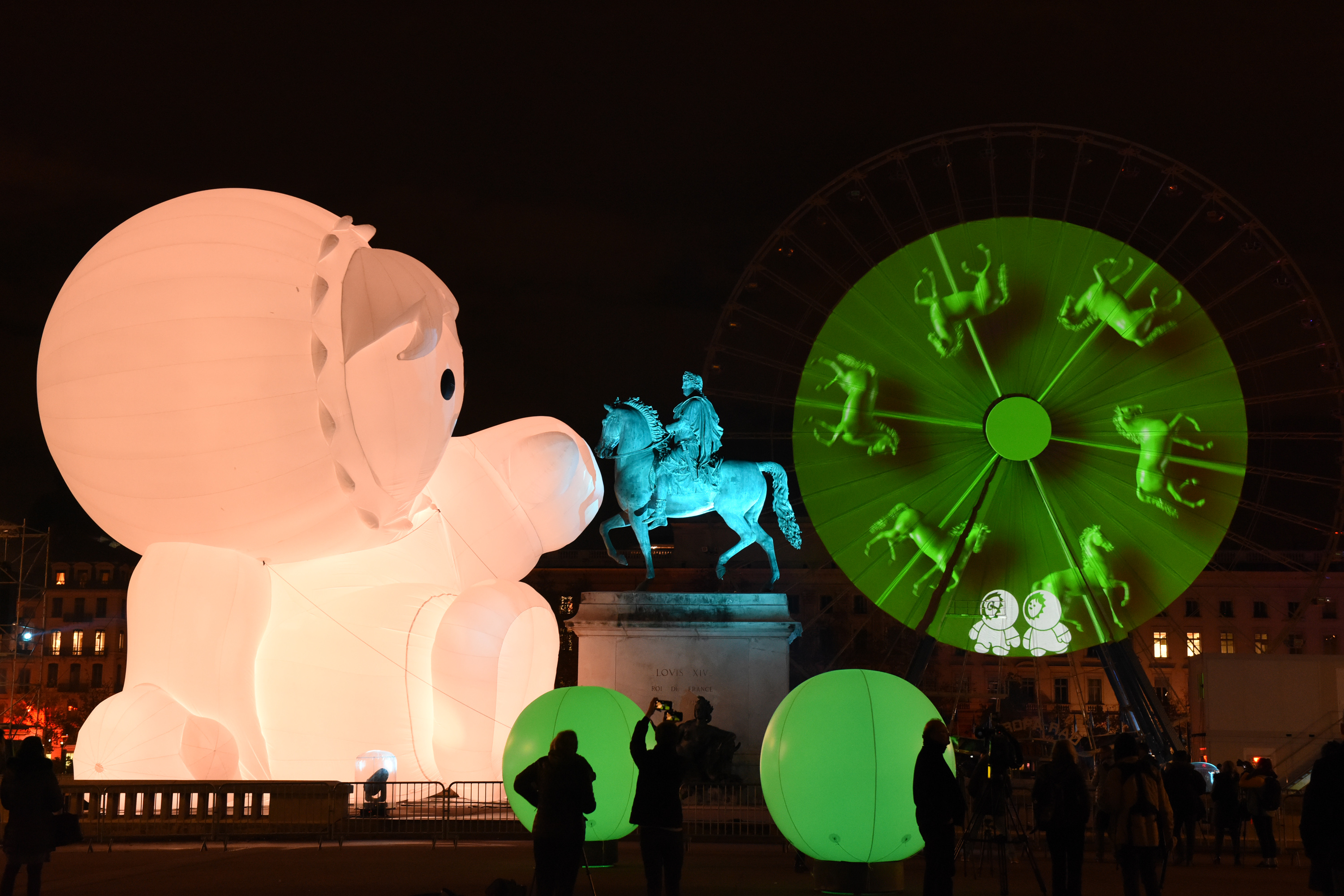 Les Anooki ont pris du relief. Immenses personnages, la place Bellecour est leur nouvelle aire de jeu. L’installation monumentale transforme les lieux en chambre d’enfant. La statue de Louis XIV à l’échelle des Anooki n’est plus qu’un petit soldat de plomb, tout comme le vrai camion de pompier qui semble être un jouet. Sur la place, des billes éparses s’illuminent au gré de la grande roue devenue veilleuse, sur laquelle, toutes les 15 minutes, sont projetés les rêves des Inuits. Les apparitions sont souvent prétextes à évoquer avec humour de grandes causes planétaires, mais surtout de faire la fête en chantant et dansant sur leur nouveau tube entêtant.