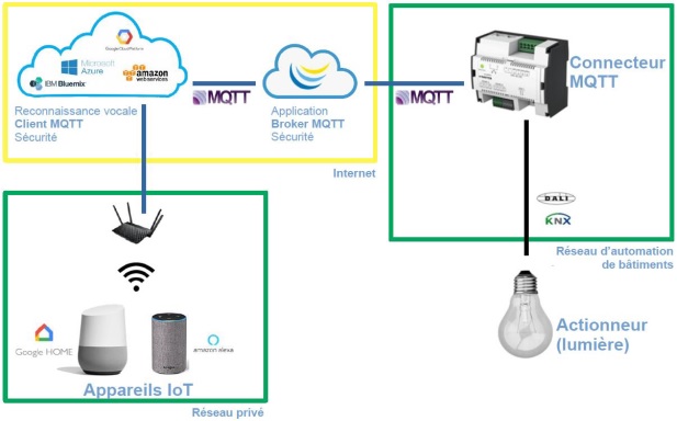 – Application via les enceintes à reconnaissance vocale telles que Google Home, Amazon Alexa pour la gestion des éclairages, des températures, de la ventilation, …