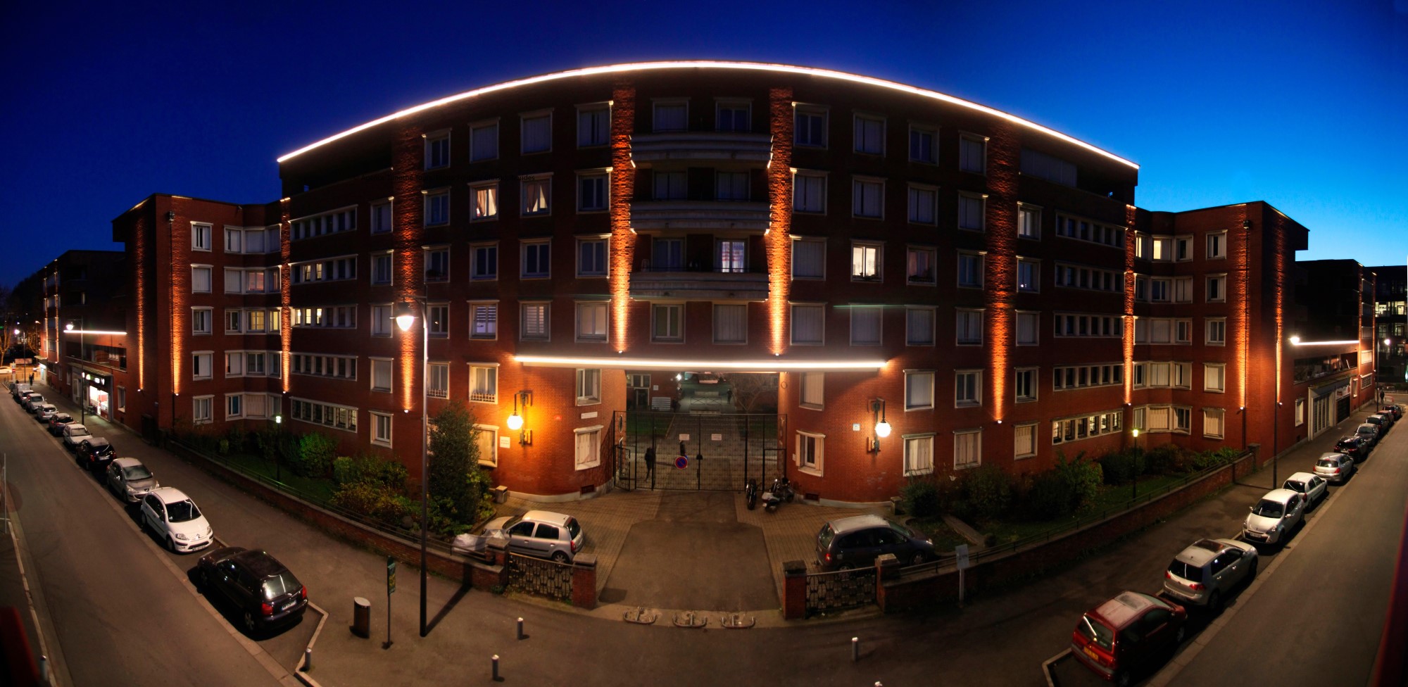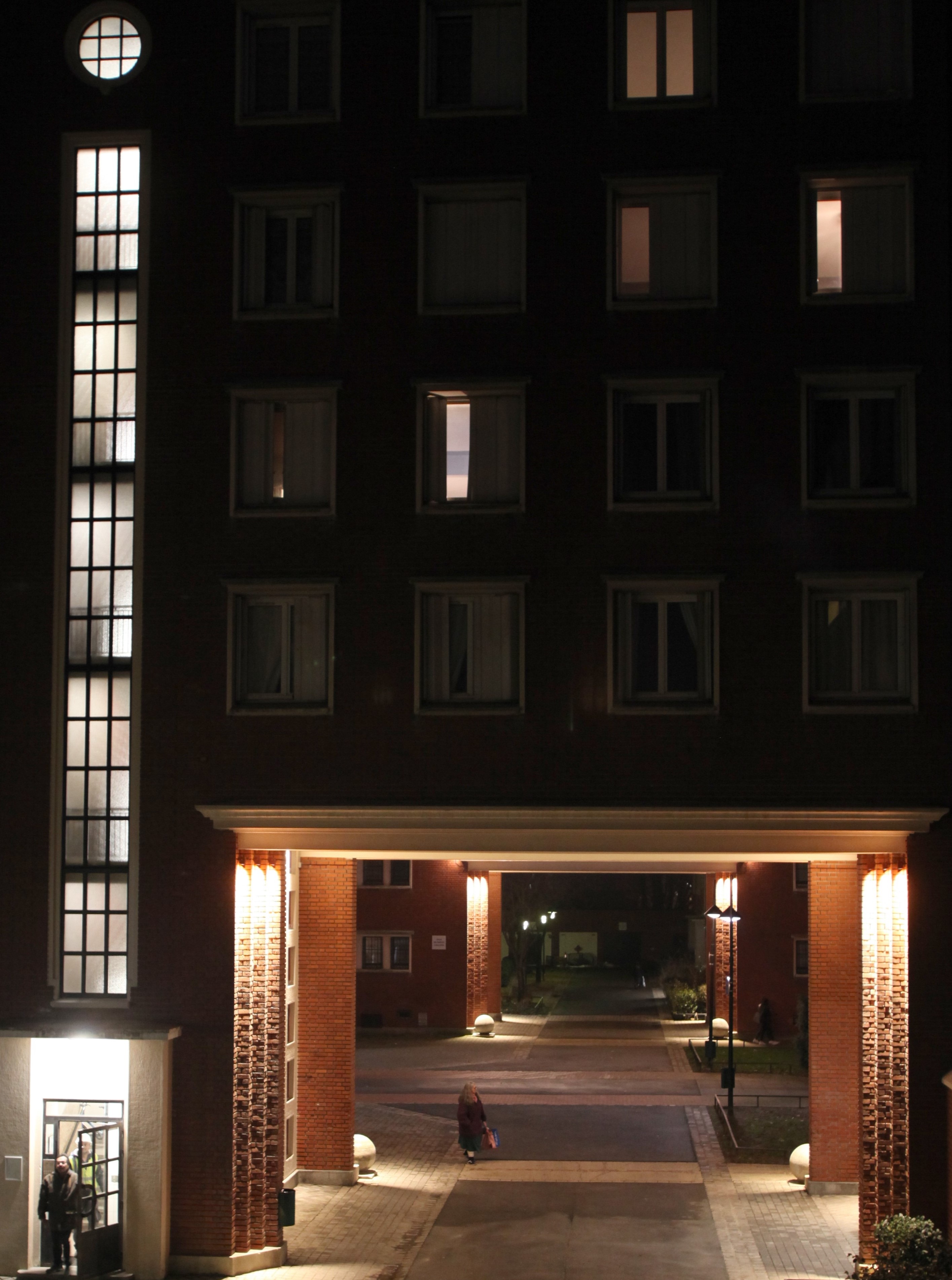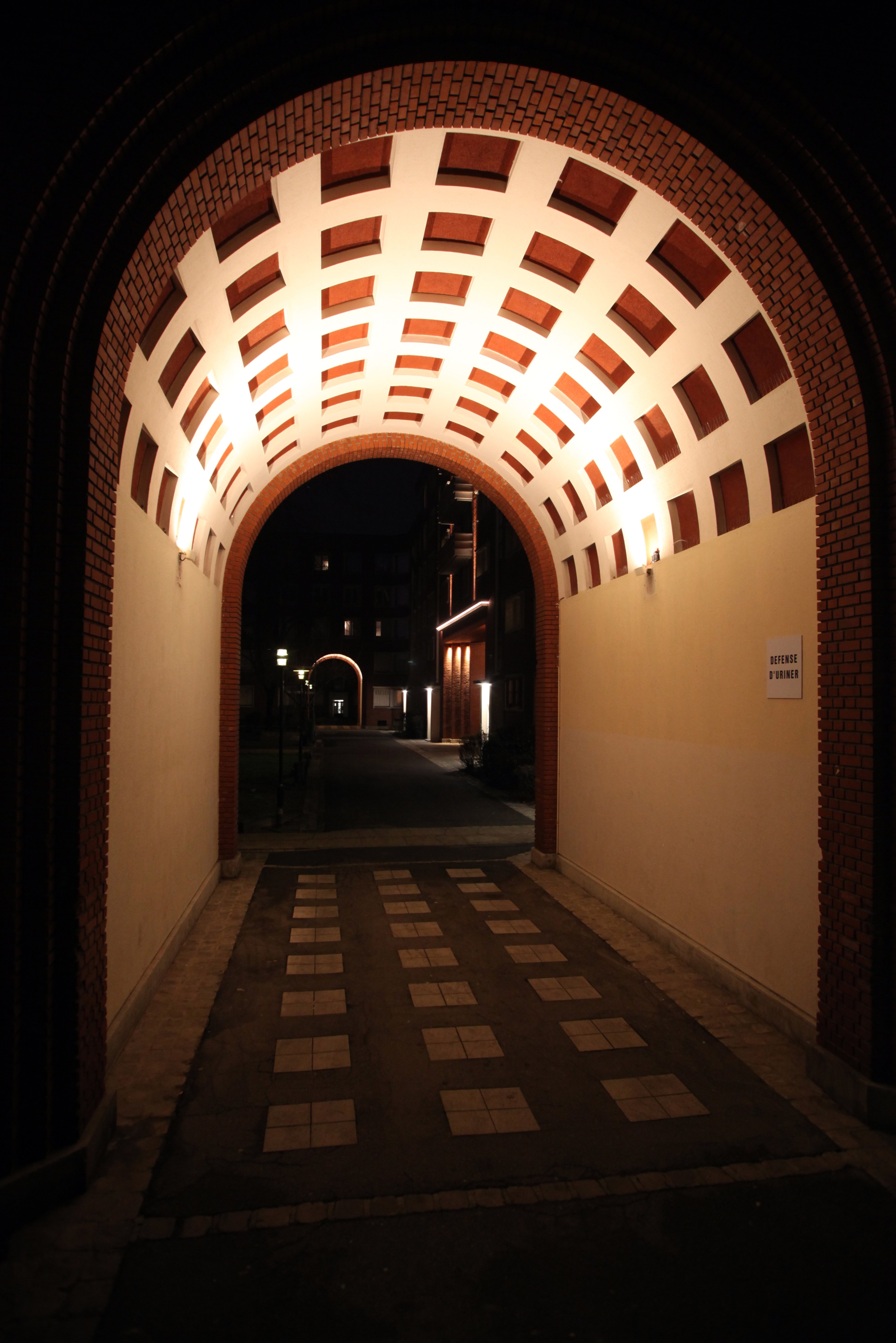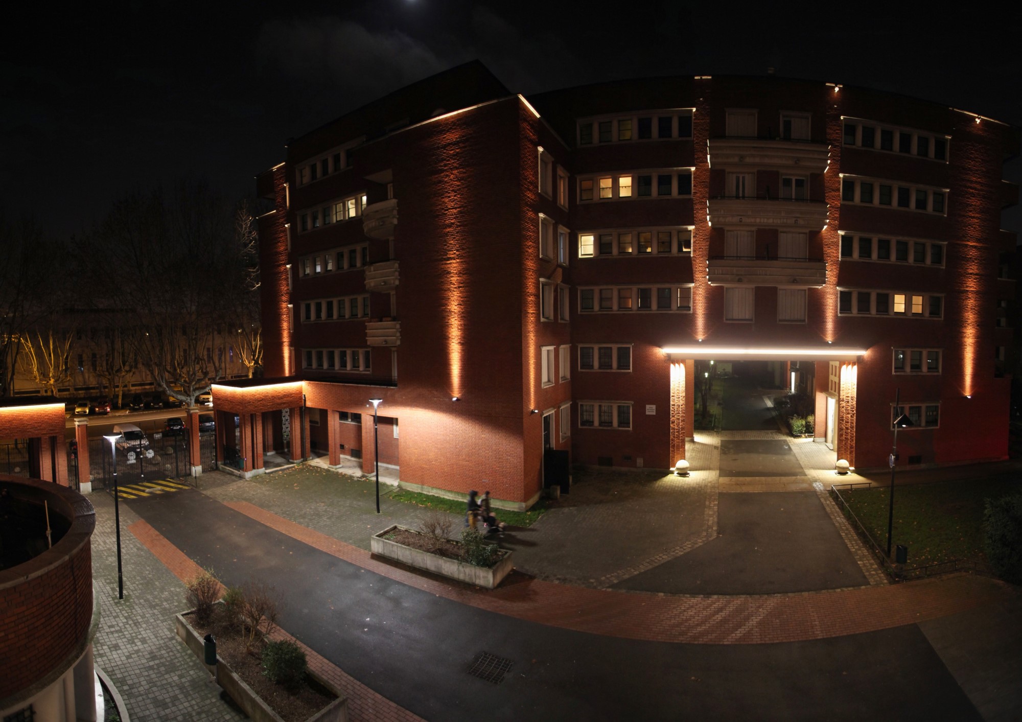 Le traitement des façades extérieures et intérieures souligne les verticales et les arrêtes des bâtiments en briques rouges en 3 000 K, tandis que les grands porches décoratifs à linteaux, porches en plein cintre et corniches s’animent également dans des tonalités de blanc chaud. Les projecteurs en faisceau serré, positionnés de part et d’autre des fenêtres des pièces d’eau, viennent en élévation des façades intérieures et extérieures. « Ils gomment en quelque sorte l’aspect massif des bâtiments en briques rouges qui bénéficient d’un éclairage rasant précis ayant nécessité des réglages d’une grande minutie. L’inclinaison de chaque diffuseur s’est faite spot par spot », ajoute Timothé Toury. Les appliques murales, distillées au gré des porches à caissons et corniches, soulignent les détails architecturaux et sécurisent les zones de circulation.