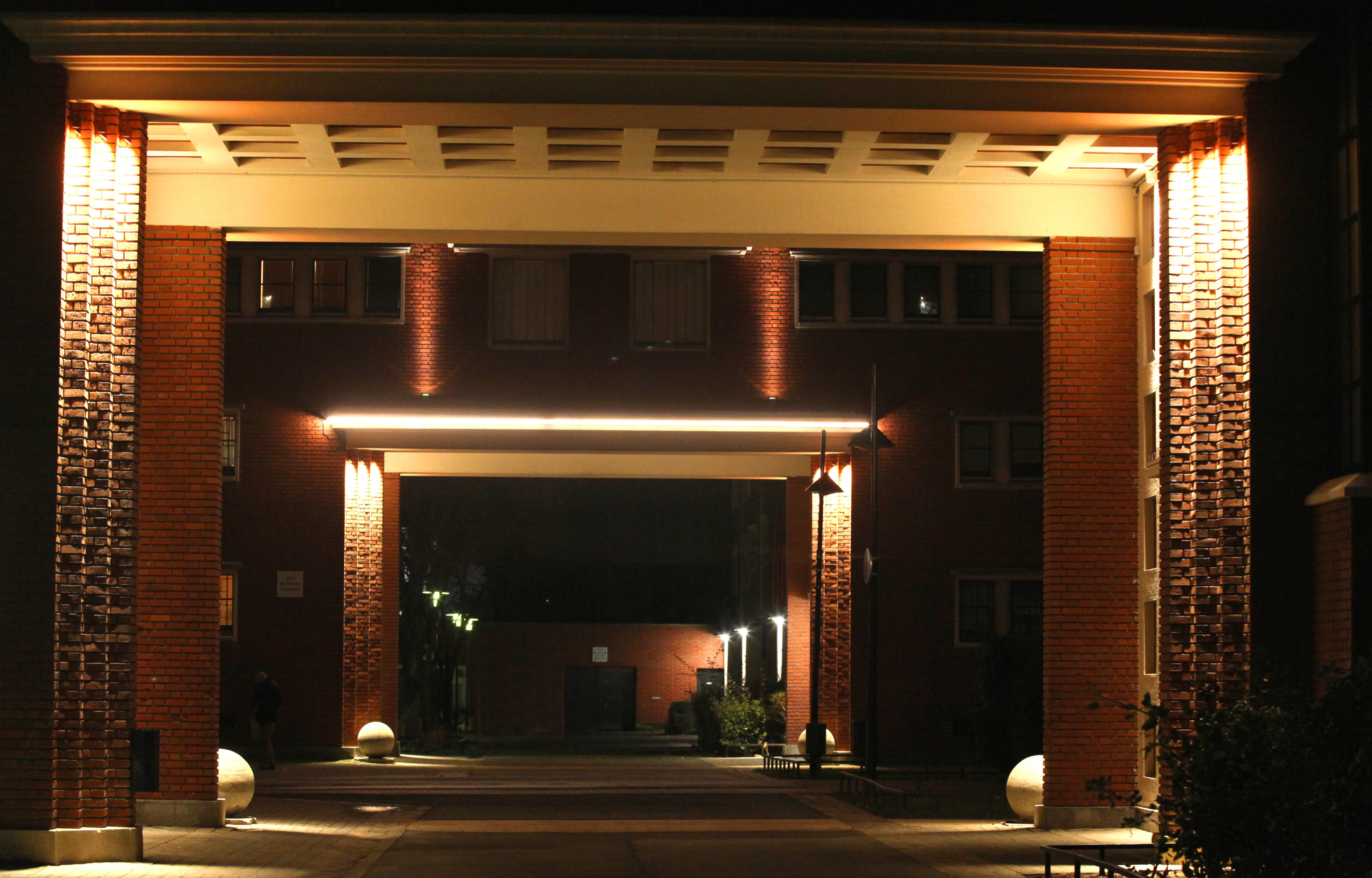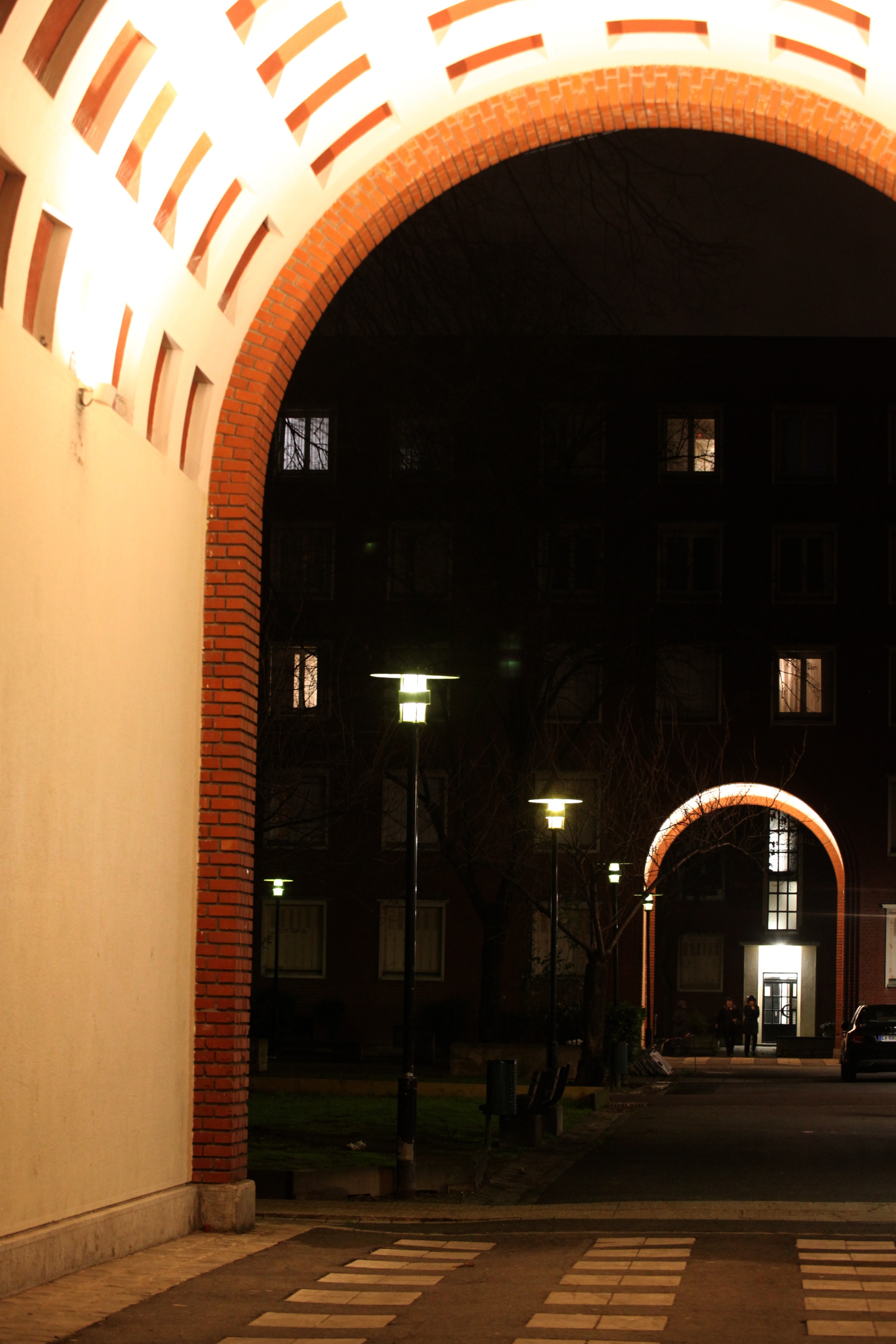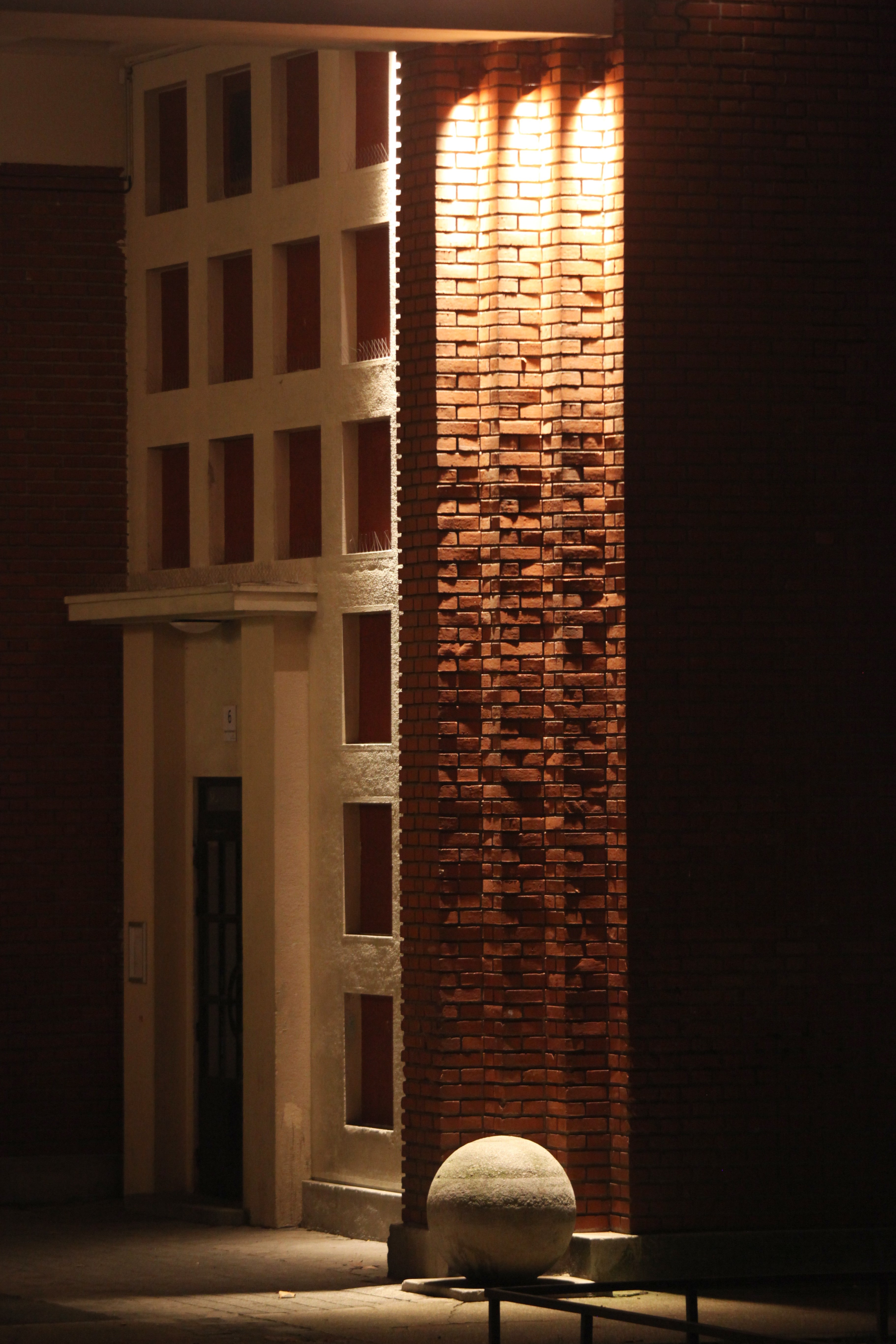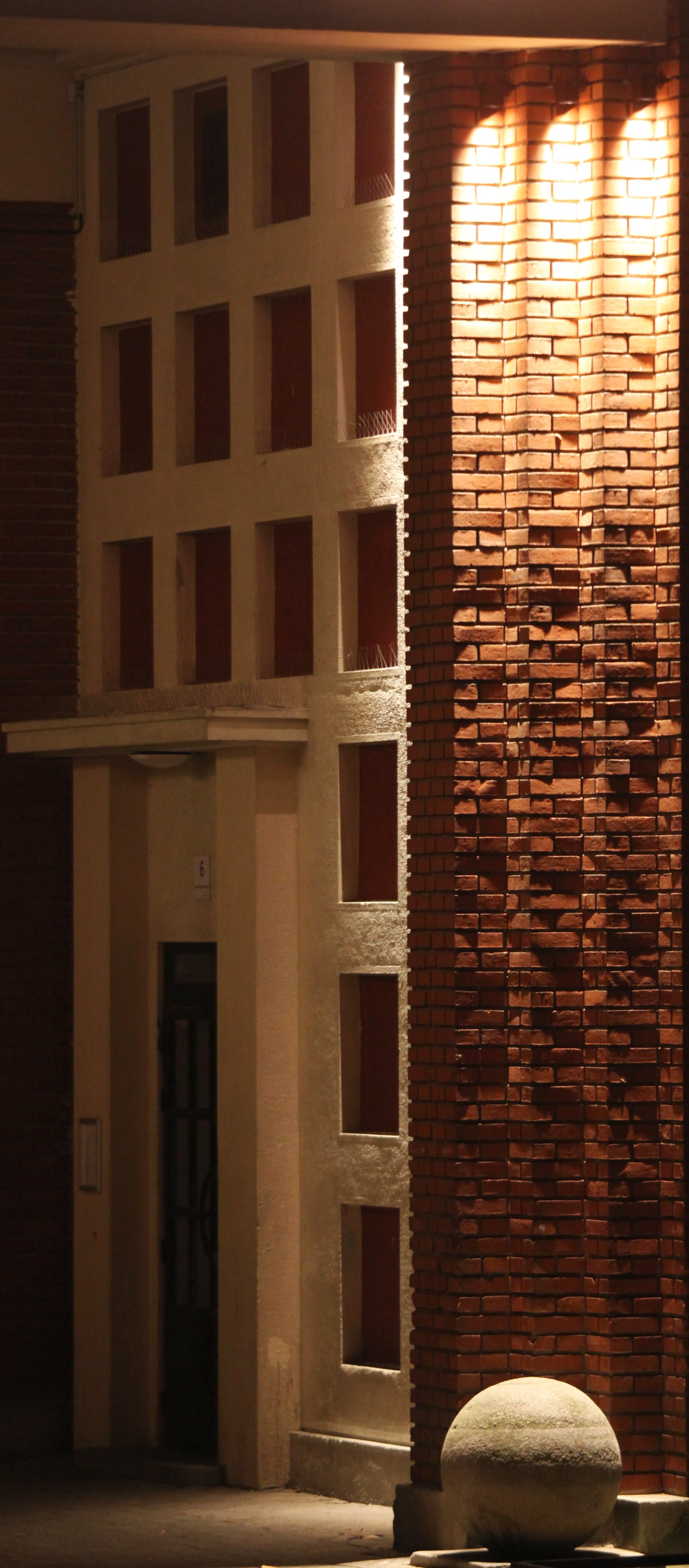 Le traitement des façades extérieures et intérieures souligne les verticales et les arrêtes des bâtiments en briques rouges en 3 000 K, tandis que les grands porches décoratifs à linteaux, porches en plein cintre et corniches s’animent également dans des tonalités de blanc chaud. Les projecteurs en faisceau serré, positionnés de part et d’autre des fenêtres des pièces d’eau, viennent en élévation des façades intérieures et extérieures. « Ils gomment en quelque sorte l’aspect massif des bâtiments en briques rouges qui bénéficient d’un éclairage rasant précis ayant nécessité des réglages d’une grande minutie. L’inclinaison de chaque diffuseur s’est faite spot par spot », ajoute Timothé Toury. Les appliques murales, distillées au gré des porches à caissons et corniches, soulignent les détails architecturaux et sécurisent les zones de circulation.