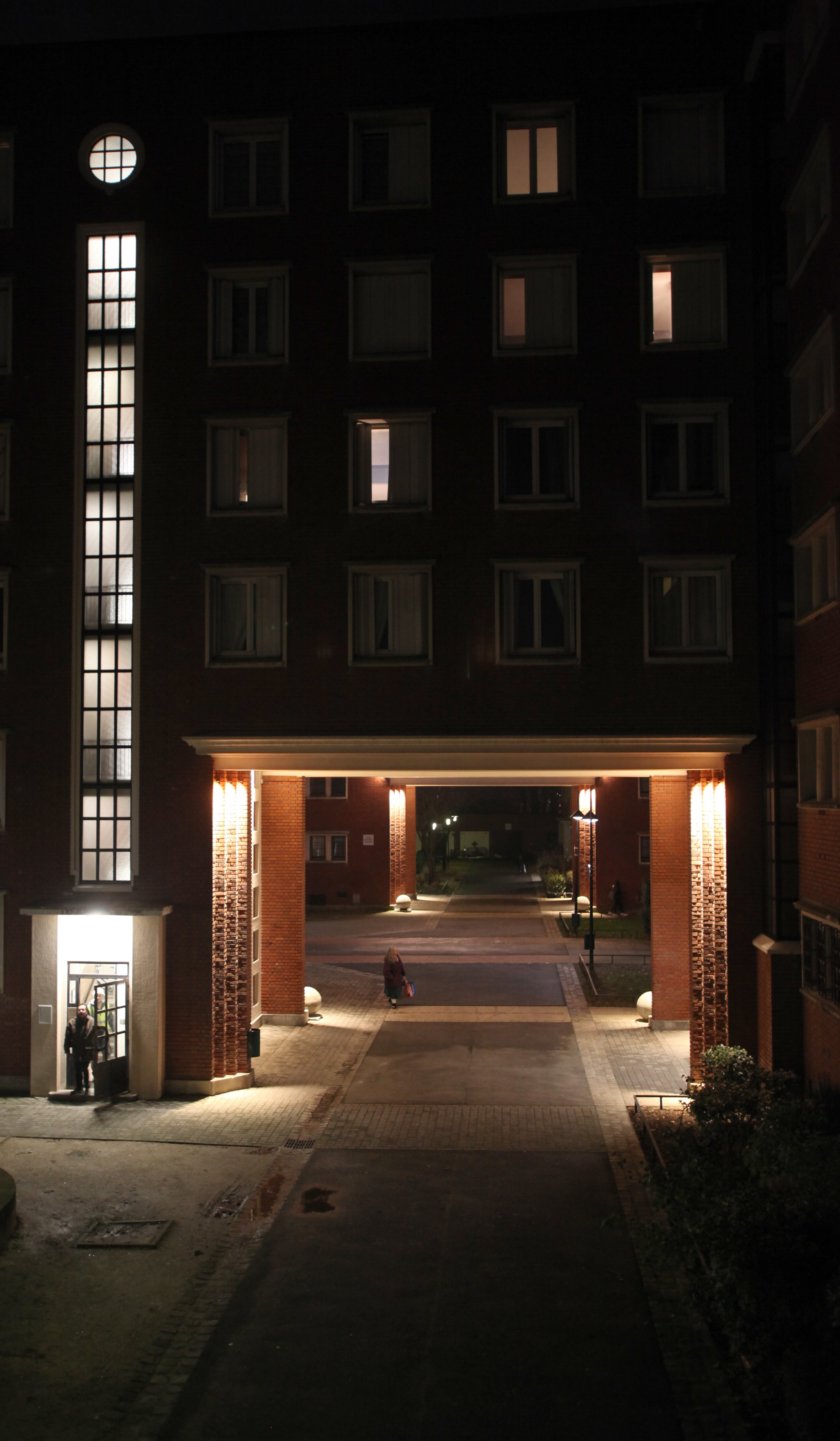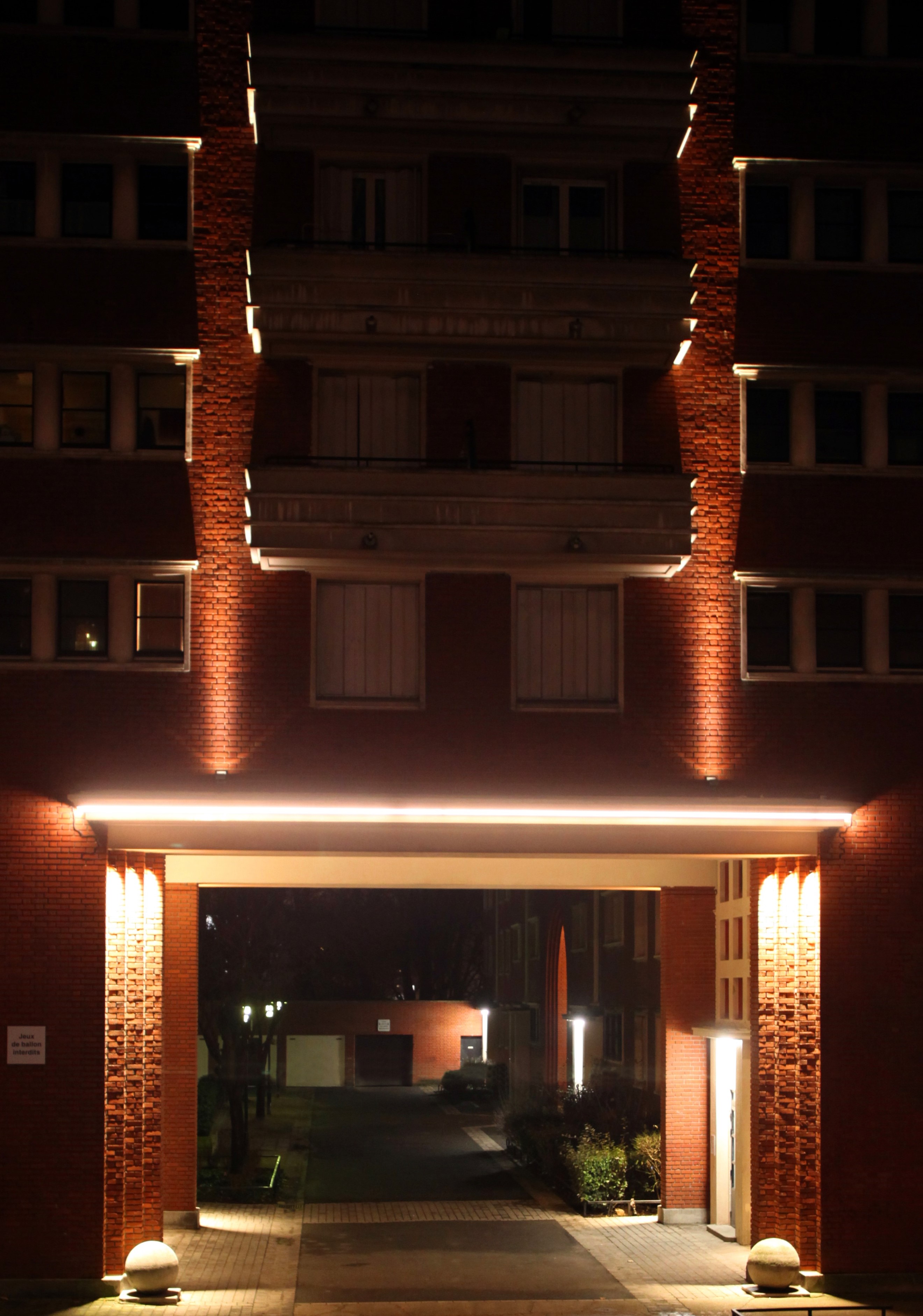 Le plan lumière a fait suite à une série de campagnes de rénovation du site, dont la mise aux normes incendie et l’isolation des 53 cages d’escalier avec le remplacement du verre cathédrale. « Ces baies verticales de grande hauteur et ouvrantes ont aussi bénéficié d’un nouvel éclairage LED intérieur équipé de dispositifs de détection de présence, précise Xavier Charlet, directeur de projet, Valophis. Cette opération a été le déclencheur de tout le projet d’éclairage réalisé dans un souci d’économie d’énergie, puisque toute l’installation est en LED et contrôlée par interrupteur crépusculaire qui déclenche l’allumage en fonction de la luminosité et programme la durée de l’éclairage selon les saisons. » L’éclairage fonctionnel des circulations, qui avait fait l’objet d’une rénovation distincte il y a quelques années, fonctionne quant à lui, toute la nuit. Timothé Toury est intervenu à la fois sur les bâtiments et les porches traversants. « La lumière doit s’exprimer dans le respect du trait et de la volonté architecturale initialement posés, sans dénaturer l’édifice.