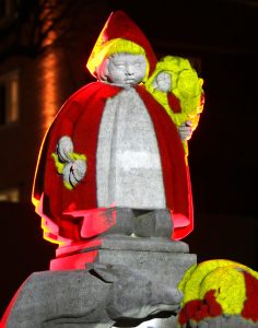 « L’œuvre en pierre grise de Saulo représentant le Petit Chaperon Rouge et le loup, au centre de l’espace public, a fait l’objet d’une mise en lumière réalisée avec des projecteurs à gobos qui offrent un aspect chromatique réaliste à la sculpture, une fois la nuit tombée », précise le concepteur lumière. Les bandeaux LED en forme de parallélépipède ont été positionnés parallèlement à chaque façade, conférant au site une signature lumineuse qui assure un effet de contrastes sur l’ensemble des façades. « L’installation de ces bandeaux fut délicate, tant pour préserver les décors existants que pour les positionner au-dessous des acrotères des balcons de grande hauteur situés avenue de la Liberté, avec l’intervention de deux équipes de cordistes », raconte Timothé Toury.