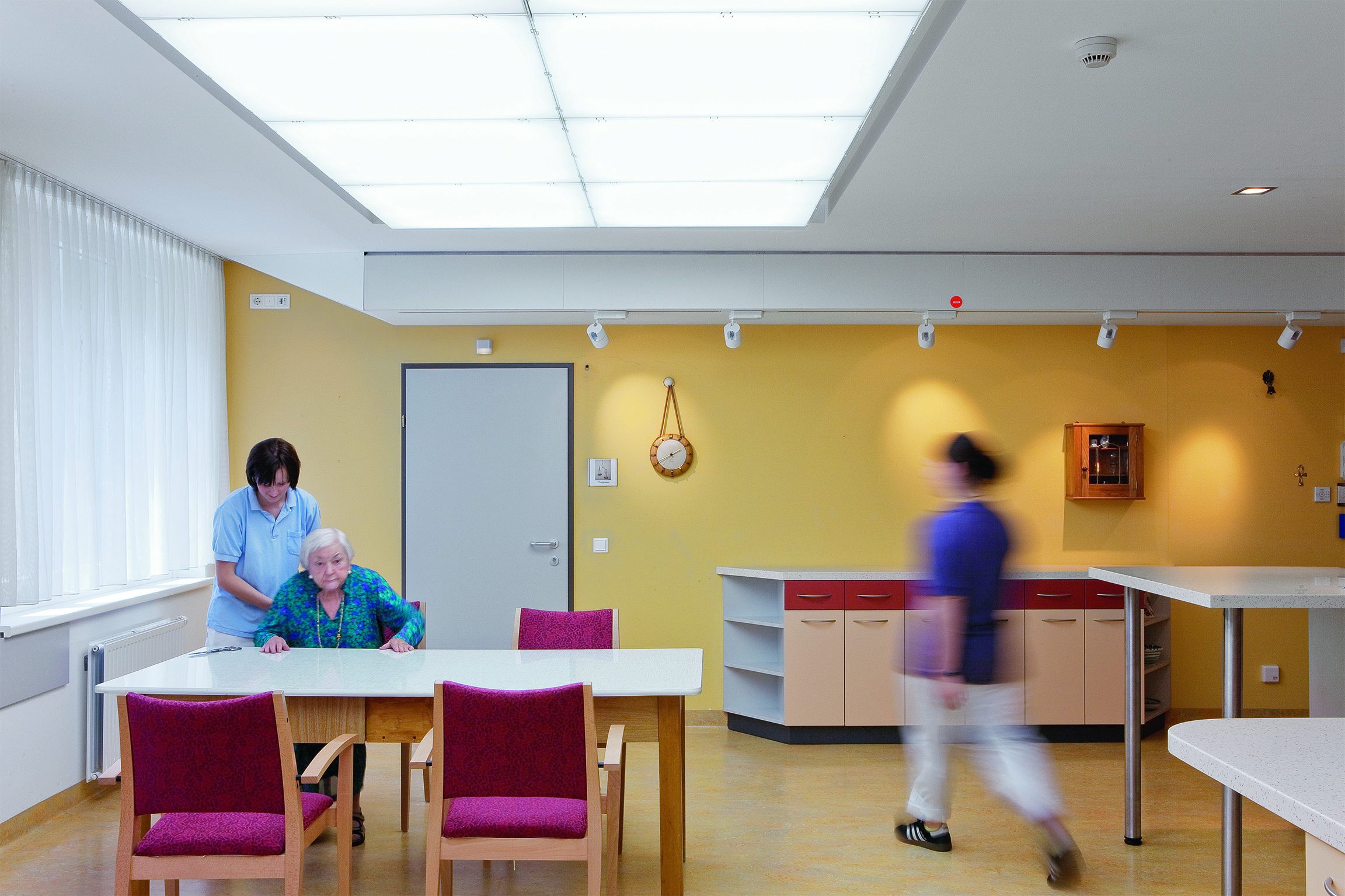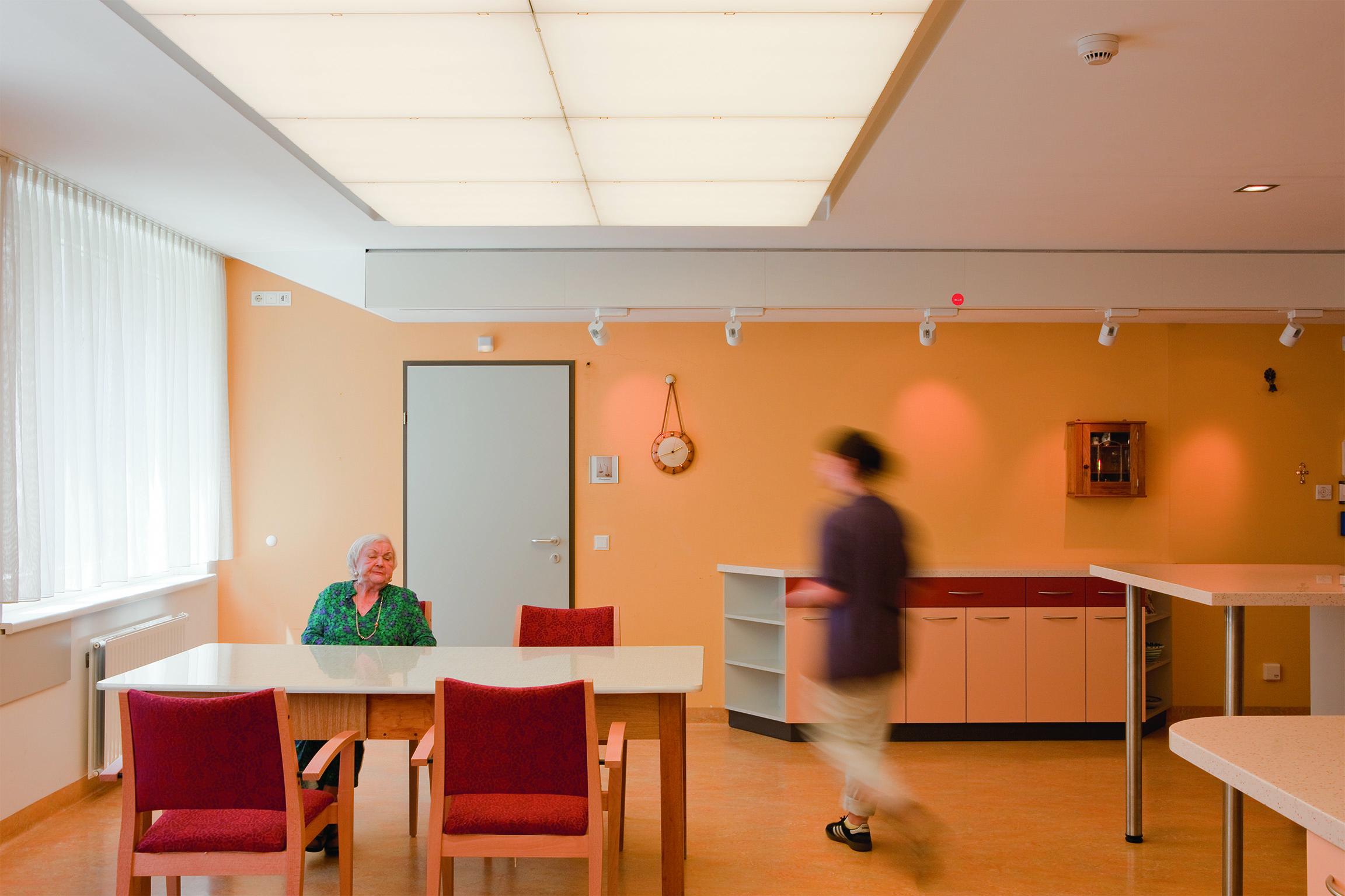 Dans la maison de retraite de St. Katharina, le concept d’éclairage a été réalisé dans l’espace collectif de l’unité et mettait en œuvre des plafonds lumineux équipés de lampes fluorescentes de 3 000 K, 6 500 K et 8 000 K avec un IRC supérieur à 80. Deux éclairages statiques et un éclairage dynamique (simulant les changements de la lumière naturelle au cours de la journée), variant au niveau de l’intensité et de la couleur de lumière, ont été conçus avec trois situations lumineuses : la situation lumineuse 1 comprenait une augmentation de l’intensité de 300 à 2 200 lux ; la situation lumineuse 2 une modification de la couleur de lumière de 3 000 K a 8 000 K ; la situation 3 une variation dynamique de l’éclairement (de 300 à 2 200 lux) et de la couleur de lumière (de 3 000 à 8 000 K) en fonction du moment de la journée. Les mesures se sont étendues sur deux ans.