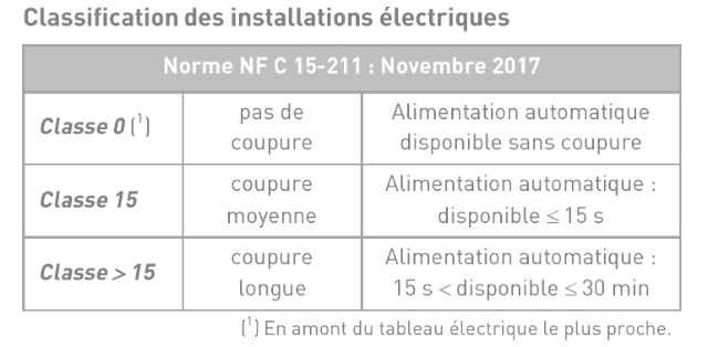 Pour le classement des locaux à usage médical, il est précisé que « la détermination du groupe et la classification des installations électriques des locaux à usage médical doivent être faites en accord avec le personnel médical et la (les) personne(s) responsable(s) de la sécurité médicale. Afin de déterminer le groupe d’un local à usage médical, il est nécessaire que le personnel médical indique les procédures médicales qui seront utilisées dans ce local ». À défaut, un tableau unique répartit ces locaux en groupes et en classes de disponibilité.
