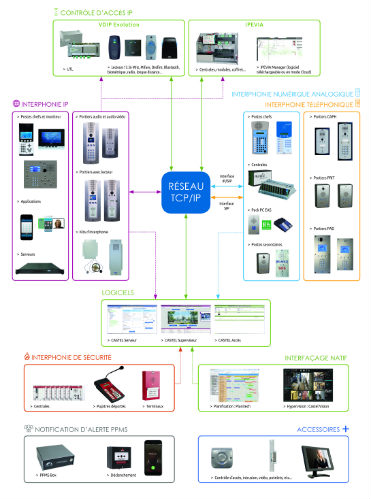 Un projet de sécurité en entreprise combine souvent plusieurs dispositifs de protection : badges RFID, vidéosurveillance, gestion des alarmes. La gestion de ces équipements qui peuvent être nombreux et dispersés en plusieurs points d’un site se fait par une gestion centralisée de tous ces systèmes de sécurité, pour pouvoir réagir en temps réel. De plus en plus, cela passe par le réseau IP auquel sont reliés les équipements : caméras, lecteurs de badge, détecteurs ou capteurs, biométrie, lecteurs Vigik (développé par La Poste, le système Vigik permet l’accès des professionnels aux parties communes des immeubles via un badge ou une clé électronique). Et, rappelle Yoann Bonnin, « dans un bâtiment tertiaire, il y a un réseau : pourquoi tirer des câbles alors que ce réseau permet d’avoir une flexibilité de fonctionnement sans aucune limite ? C’est juste de la programmation alors qu’avec un interphone filaire, il faut tirer des câbles. En IP, il n’y a pas de difficultés et cette flexibilité de l’IP correspond à l’usage du tertiaire mais aussi de l’industrie. Sur un réseau TCP/IP vont pouvoir ainsi se connecter : interphonie d’accès visiteur, interphonie d’accès parking, contrôle d’accès personnel, supervision graphique, détection d’intrusion, accès parking, accès bureau du personnel, détection d’intrusion bureaux, ascenseurs, smartphones. La gestion de la voix, des images et des données se fait alors sur IP ».