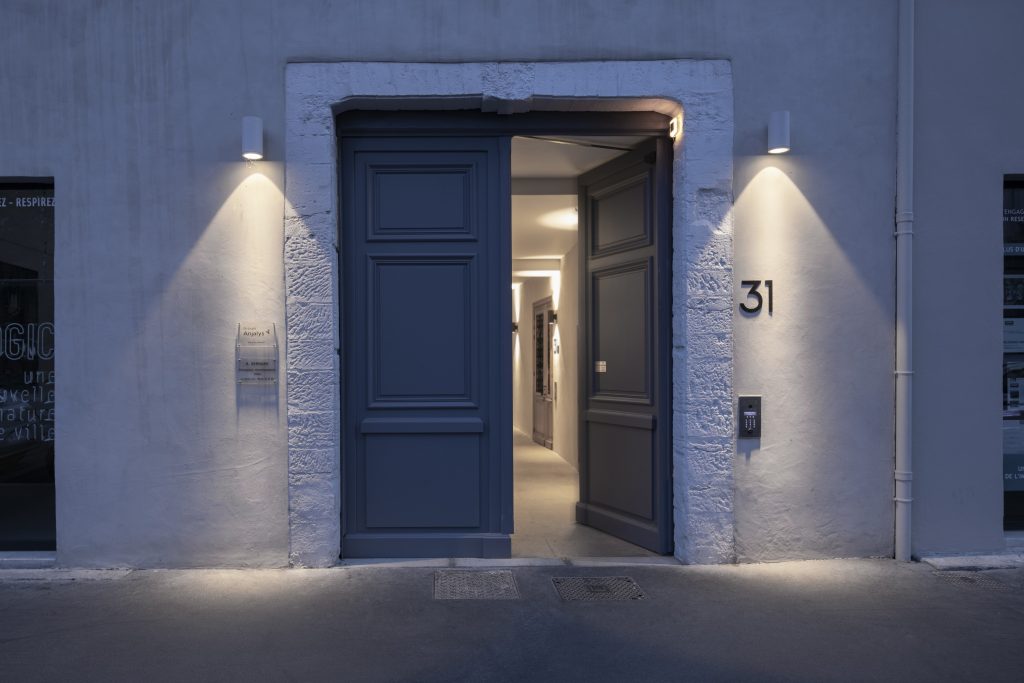 Pour Florence Romersa, architecte de formation, qui a été chef de projet chez Les Éclairagistes Associés, puis responsable de l’éclairage public dans une importante intercommunalité d’Île-de-France, avant son association au sein de Frys Associés, c’est une évidence : il faut traiter le champ nocturne aux dimensions de la ville. Elle travaille donc à son échelle, tenant compte, pour chaque projet, de sa constitution, de son fonctionnement, depuis la première intention jusqu’à la mise en œuvre. « Je m’appuie sur deux fils conducteurs : la ville et la dualité diurne/nocturne, et ce, pour tous mes projets. De plus, étant Méditerranéenne, j’ai un rapport particulier à la lumière, qu’elle soit naturelle ou artificielle, explique Florence Romersa. Pour ce qui concerne le 31, place Bellecour, nous avons plutôt abordé ensemble la lumière publique et la lumière privée pour une intégration complète dans le site. » La conception lumière repose sur une hiérarchisation des éclairages avec un travail sur l’orientation et le guidage de façon à « appeler » les gens à pénétrer dans cet îlot peu visible de la rue, et inversement, à les conduire de ces bâtiments vers l’extérieur. Les parcours sont ainsi définis par la lumière : les façades des porches d’entrée côté place Bellecour et côté rue du Plat sont marquées par des appliques LED de Bega directionnelles de teinte chaude (3 000 K) disposées latéralement et calées sur le régime de l’éclairage public en termes de temporalité (allumage/extinction). De façon générale, la composition chromatique s’accorde avec les architectures et leur histoire : des températures de couleur chaudes ont été utilisées pour les appliques bidirectionnelles Bega sur les parties patrimoniales, passages couverts, porches, croisées d’ogives, tandis que le bâti moderne, notamment l’immeuble de verre conçu par Ory, est éclairé en teintes plus froides.