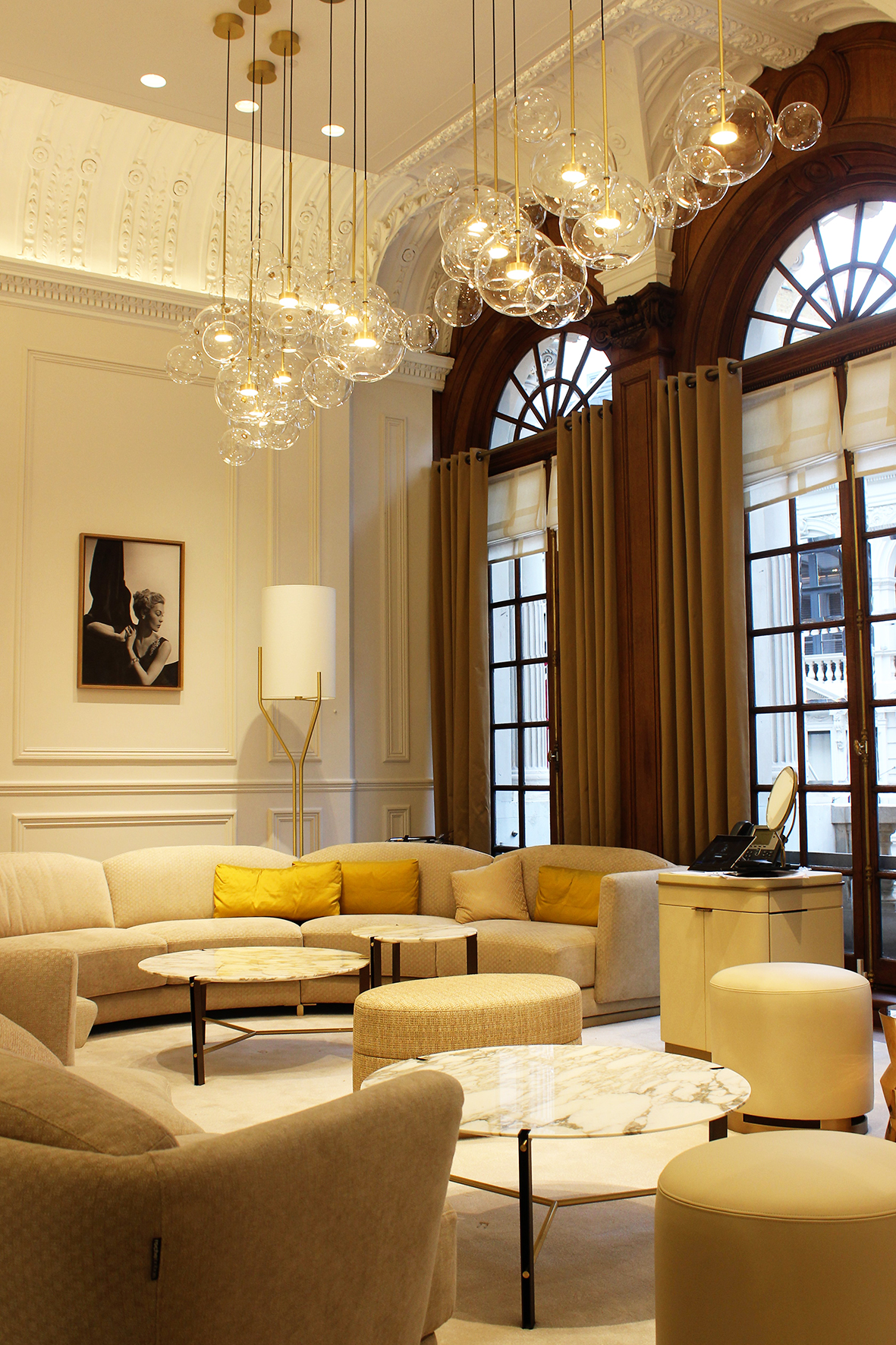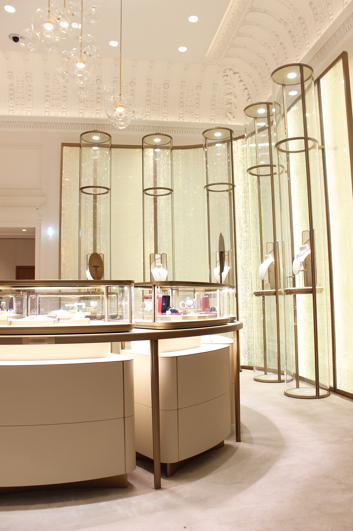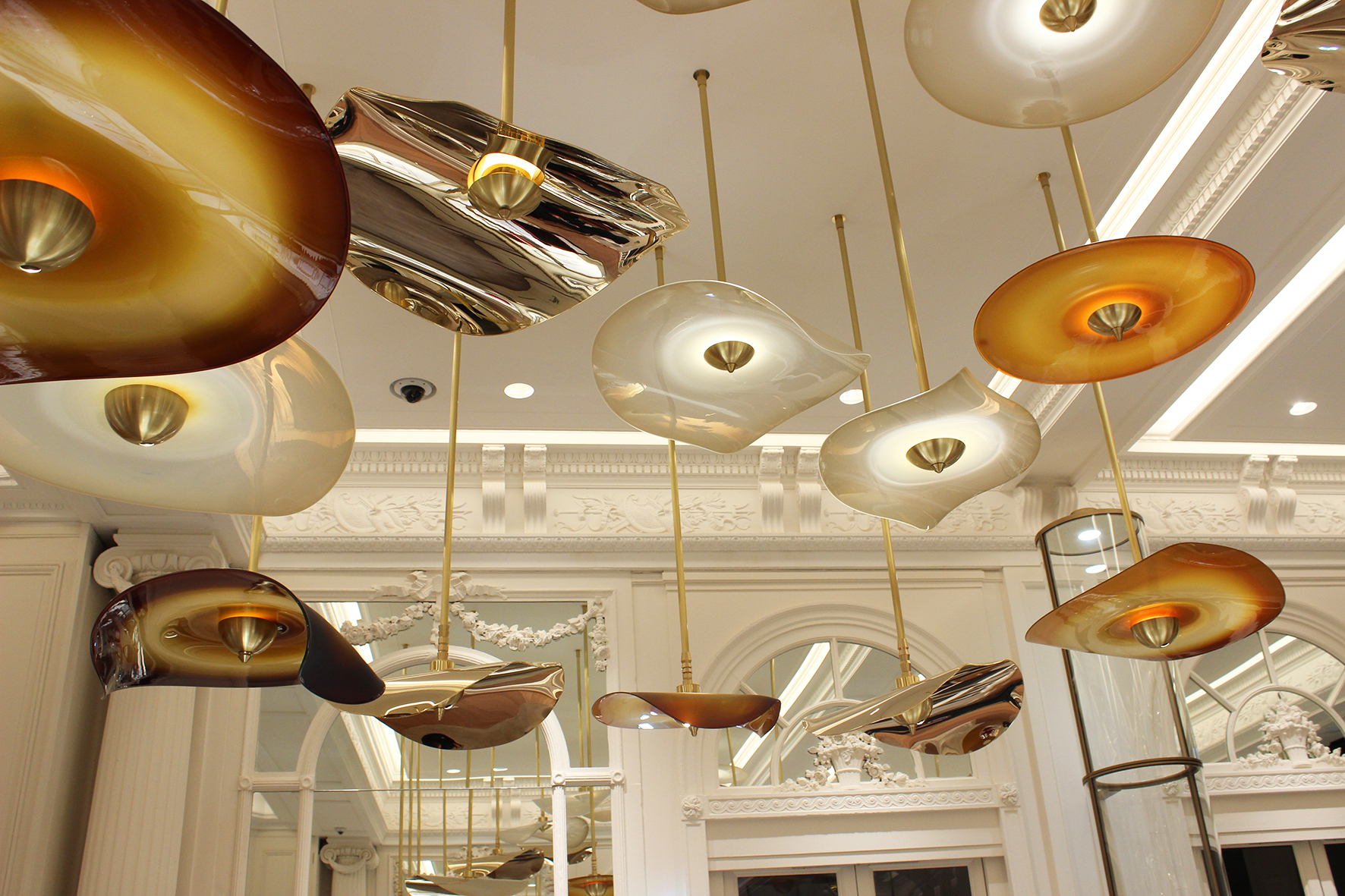 Dans le hall d’entrée, la lumière naturelle, réfléchie par les boiseries qui, ici, ont été repeintes en blanc, donne encore plus de majesté à cet espace, tandis que l’éclairage indirect des corniches souligne les moulures. Ponctuant cette nappe d’une blancheur éclatante, des suspensions décoratives en pâte de verre et laiton, dessinées par 4BI et développées par Mydriaz, apportent des touches de couleur ambre et crème. Un travail de développement de mini spots dans le cœur des pétales a été réalisé afin de permettre un éclairage orienté sur les bijoux dans les comptoirs.