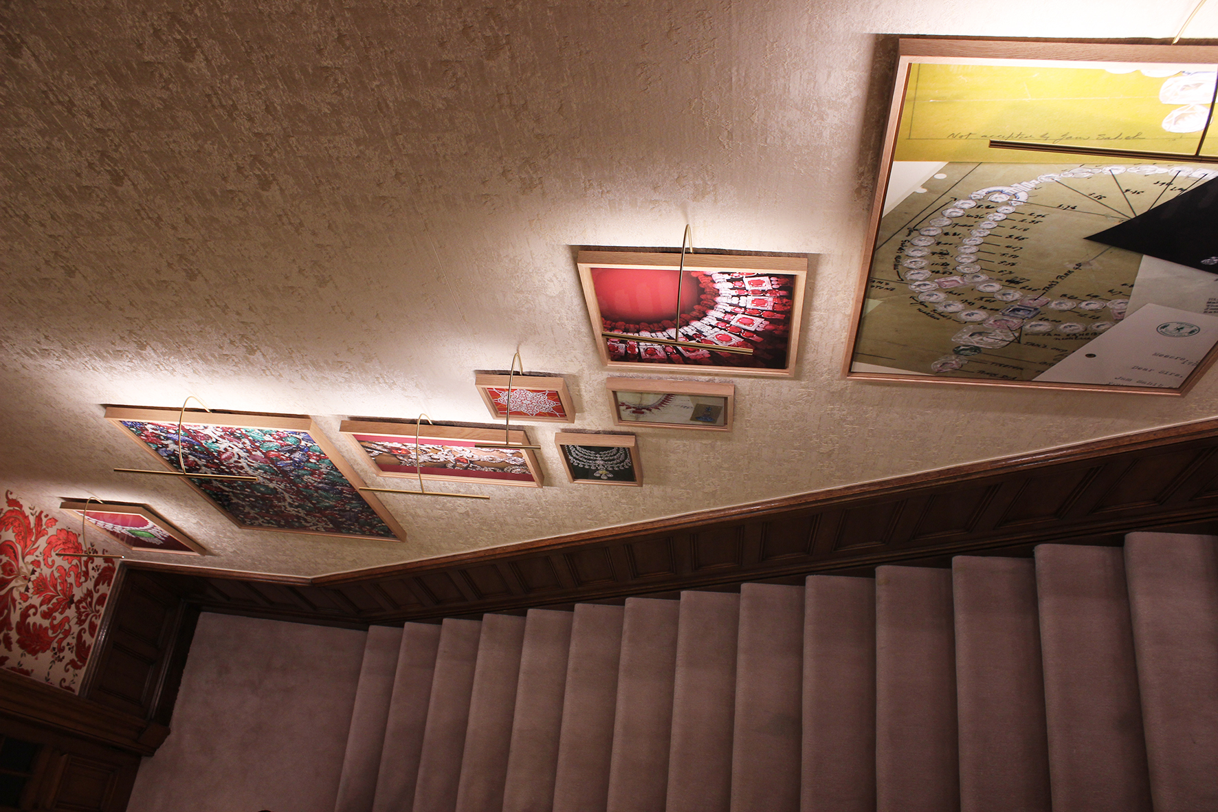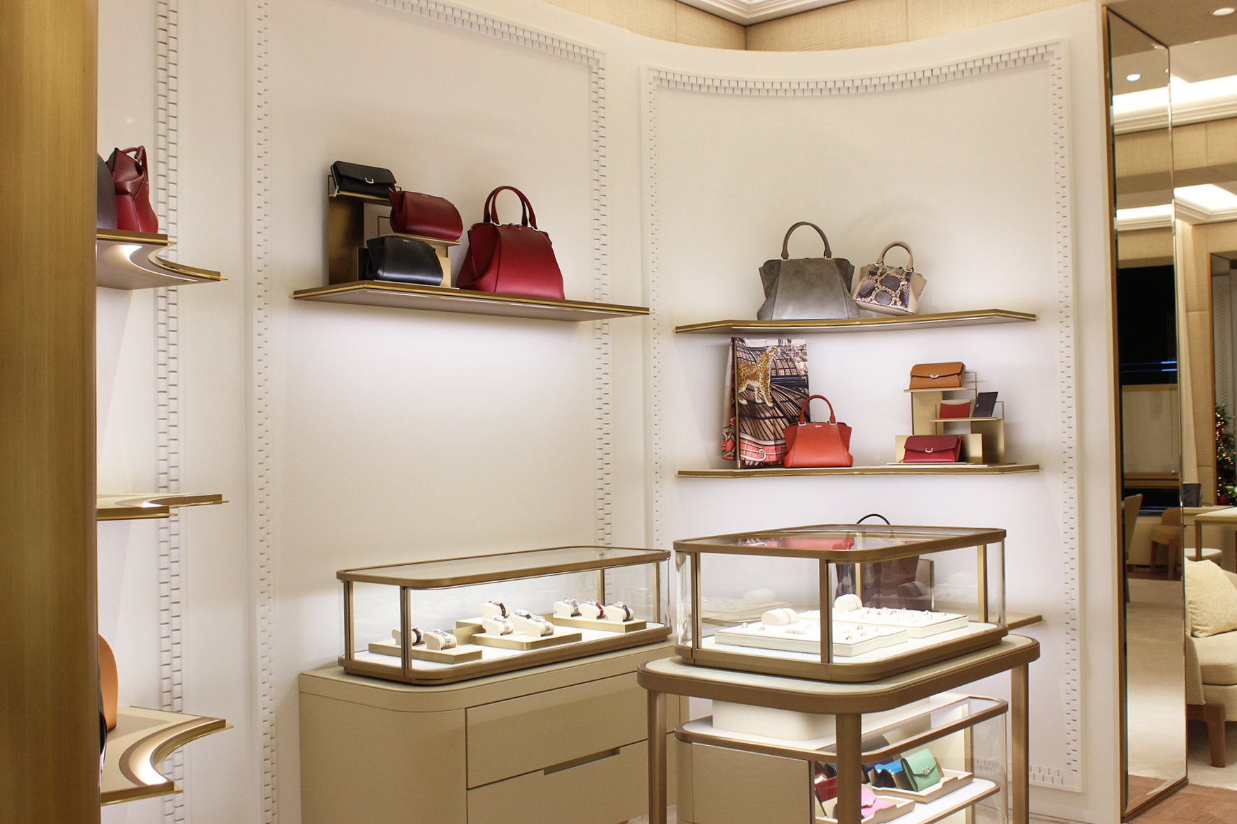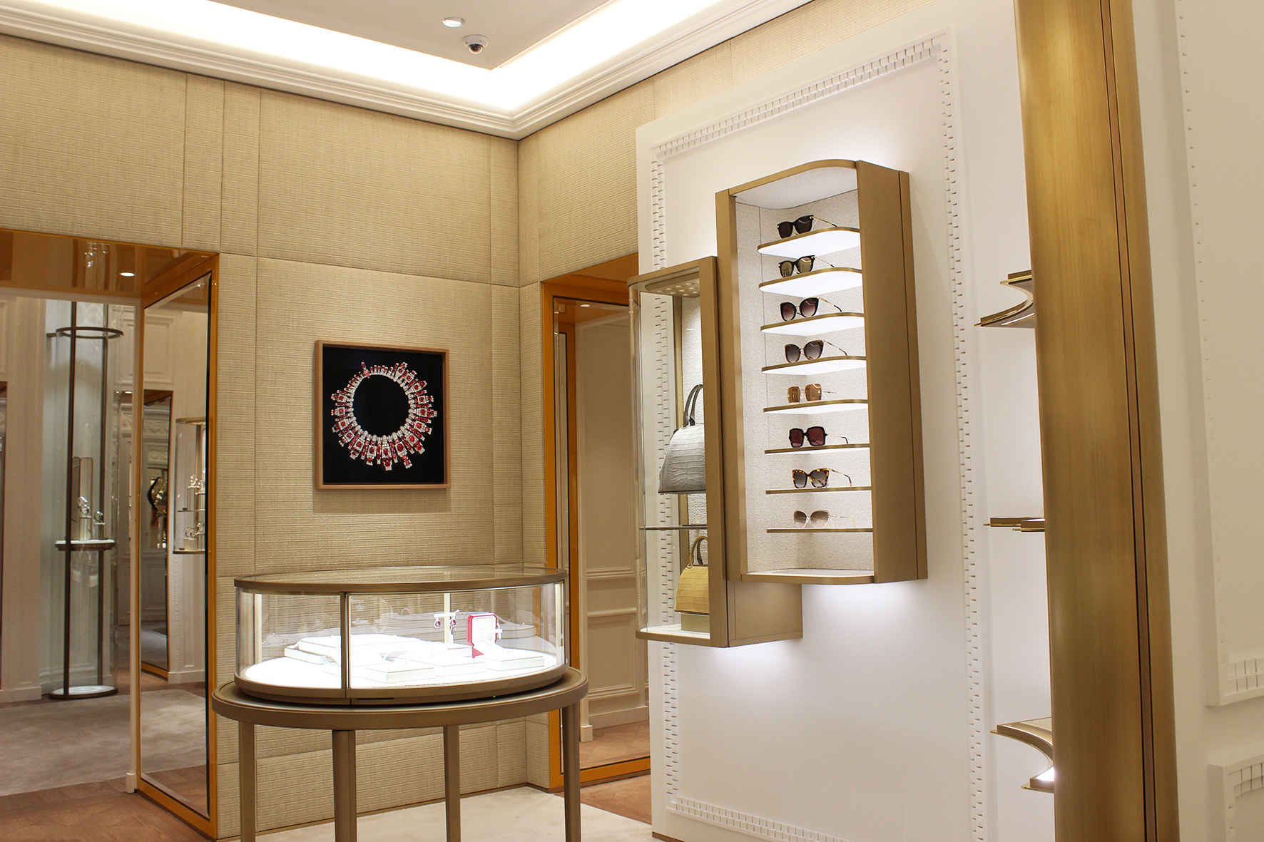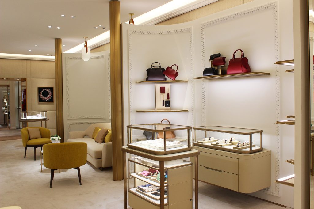 Dans les différents salons et escaliers, les nombreuses iconographies qui tapissent les parois ont été soulignées par un éclairage directionnel ; les accessoires, sacs, lunettes, exposés sur des tablettes ou dans des vitrines sont éclairés de la même façon. À mi-chemin entre la mise en valeur de produits et la théâtralisation muséographique, la présentation des bijoux fait appel à une lumière plus froide de 4 000 K, température de couleur choisie afin de faire ressortir l’éclat des bijoux par des spots encastrés à faisceau serré. Pour la mise en valeur des accessoires, des spots 3 000 K révèlent les teintes des cuirs.