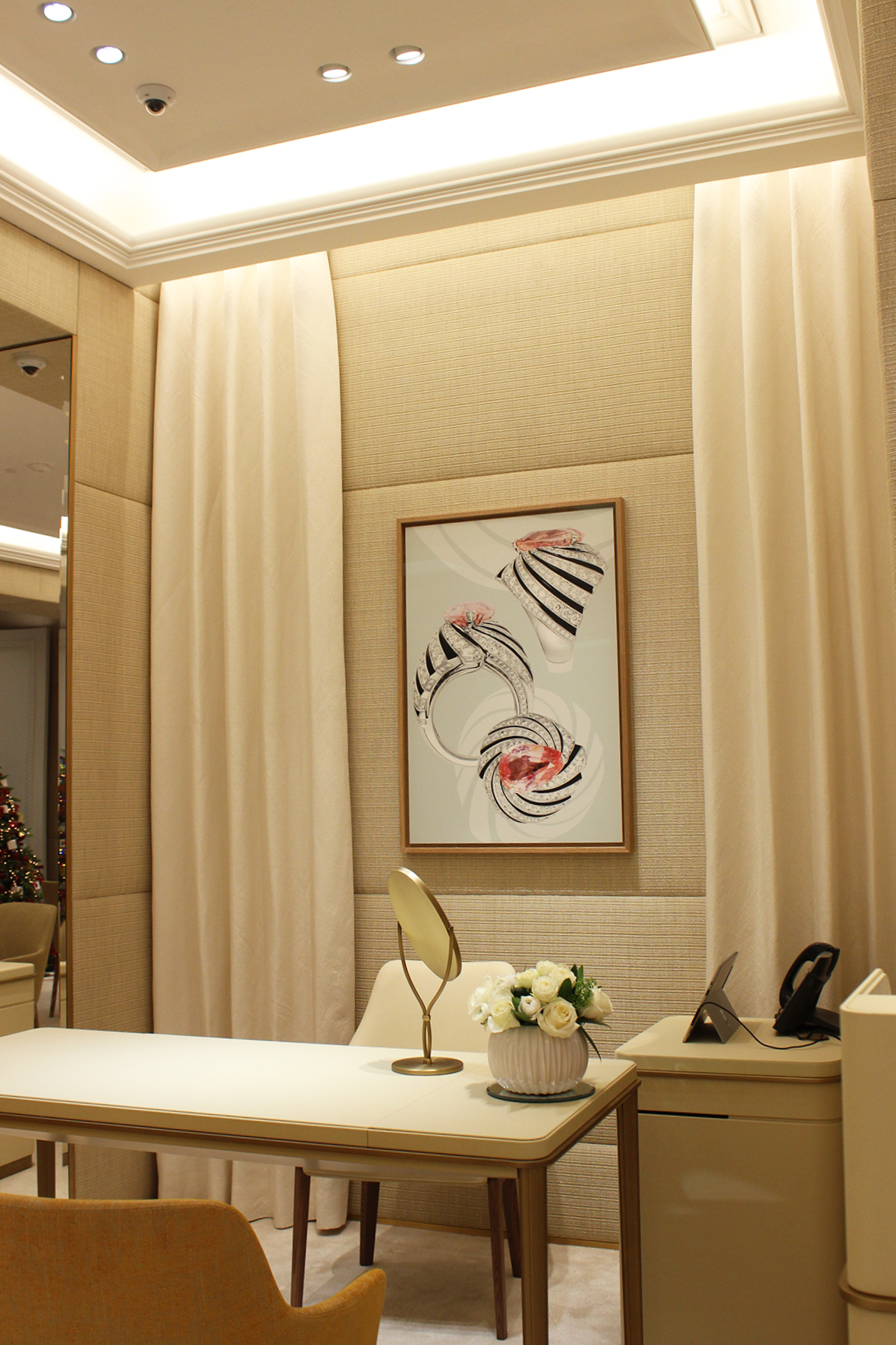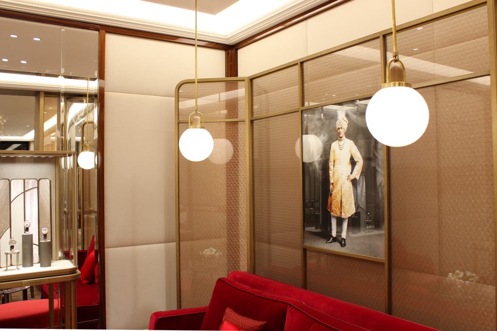 Toute une série de salons ont été aménagés afin de rendre la plus confortable possible l’expérience du client. Le salon VIP Men, décoré en hommage à un maharaja de l’Empire britannique, plus bas de plafond que les autres espaces, est éclairé en indirect par des gorges lumineuses et quelques points lumineux en direct sur la table de vente et devant le canapé. Deux températures de couleur sont mises en œuvre : 4 000 K pour les bijoux et 3 000 K pour les accessoires. « Toutes les vitrines comprennent un éclairage embarqué afin de rendre tout leur éclat aux pierres précieuses, tout en évitant de voir la source ou d’avoir des reflets gênants, commente Clémence Vitrac. De même, pour le mobilier mural et les accessoires présentés sur des tablettes, l’éclairage est intégré à l’intérieur pour réduire le nombre de spots en plafond. Cependant, pour chaque comptoir et vitrine, un spot à faisceau serré est dirigé vers les produits de façon qu’ils brillent toujours sous la lumière, même une fois sortis de leurs présentoirs. »