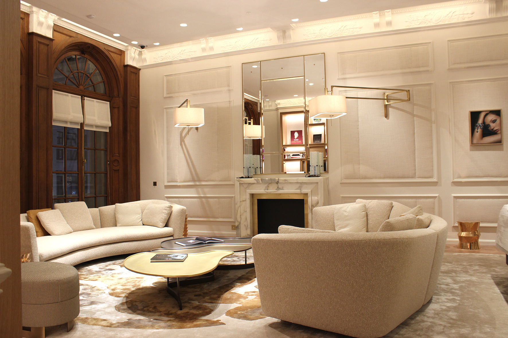 La boutique a emprunté à l’appartement les codes de confort afin de rendre les ambiances plus intimistes. « Nous avons eu recours à quelques subtilités, puisqu’il nous fallait absolument préserver les éléments architecturaux tout en les révélant », poursuit la conceptrice lumière. Ainsi, un éclairage indirect d’ambiance a-t-il été intégré dans les corniches, tandis que des spots encastrés au plafond assurent un éclairage discret et ponctuel sur les collections exposées.