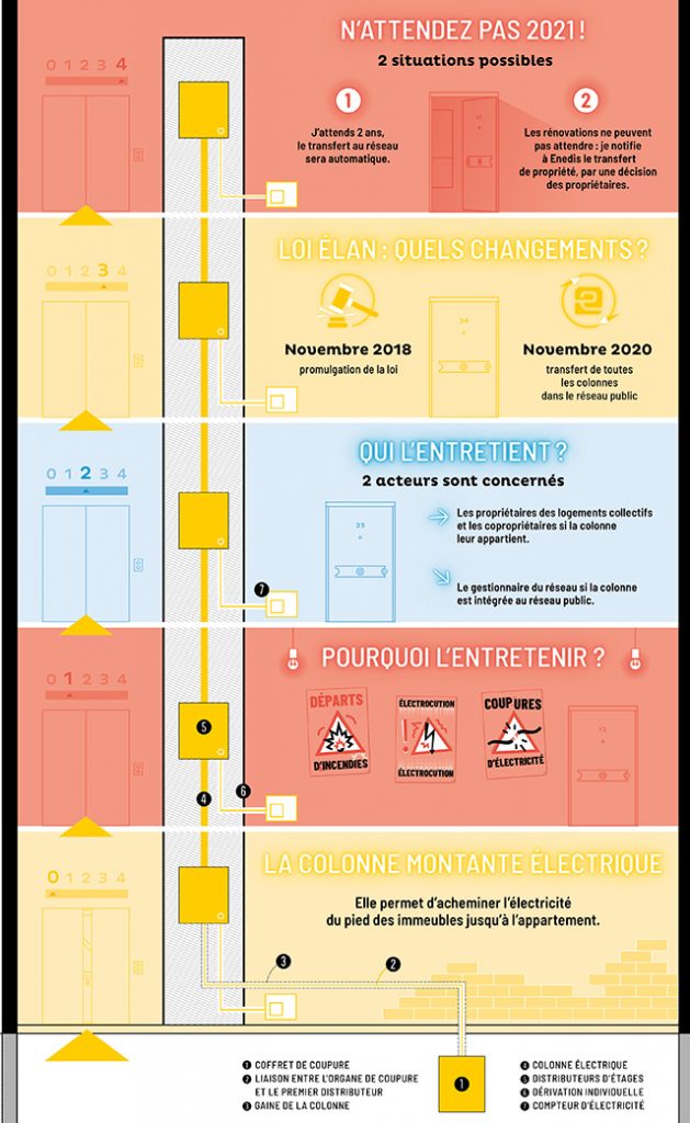 La loi Elan du 23 novembre 2018 comprend une disposition relative à « la reprise en concession par le gestionnaire de réseau de distribution (GRD) des colonnes montantes électriques » dans un délai de 2 ans au maximum. Ainsi, à compter du 23 novembre 2020, toutes les colonnes montantes seront intégrées au réseau public de distribution d’électricité (RPD). En tant que GRD, Enedis devra alors en assurer l’entretien ou la rénovation. Les copropriétaires d’immeubles qui le souhaitent ont également la possibilité, notamment par le biais des syndics, de transférer volontairement au RPD les colonnes montantes avant la fin du délai de 2 ans.