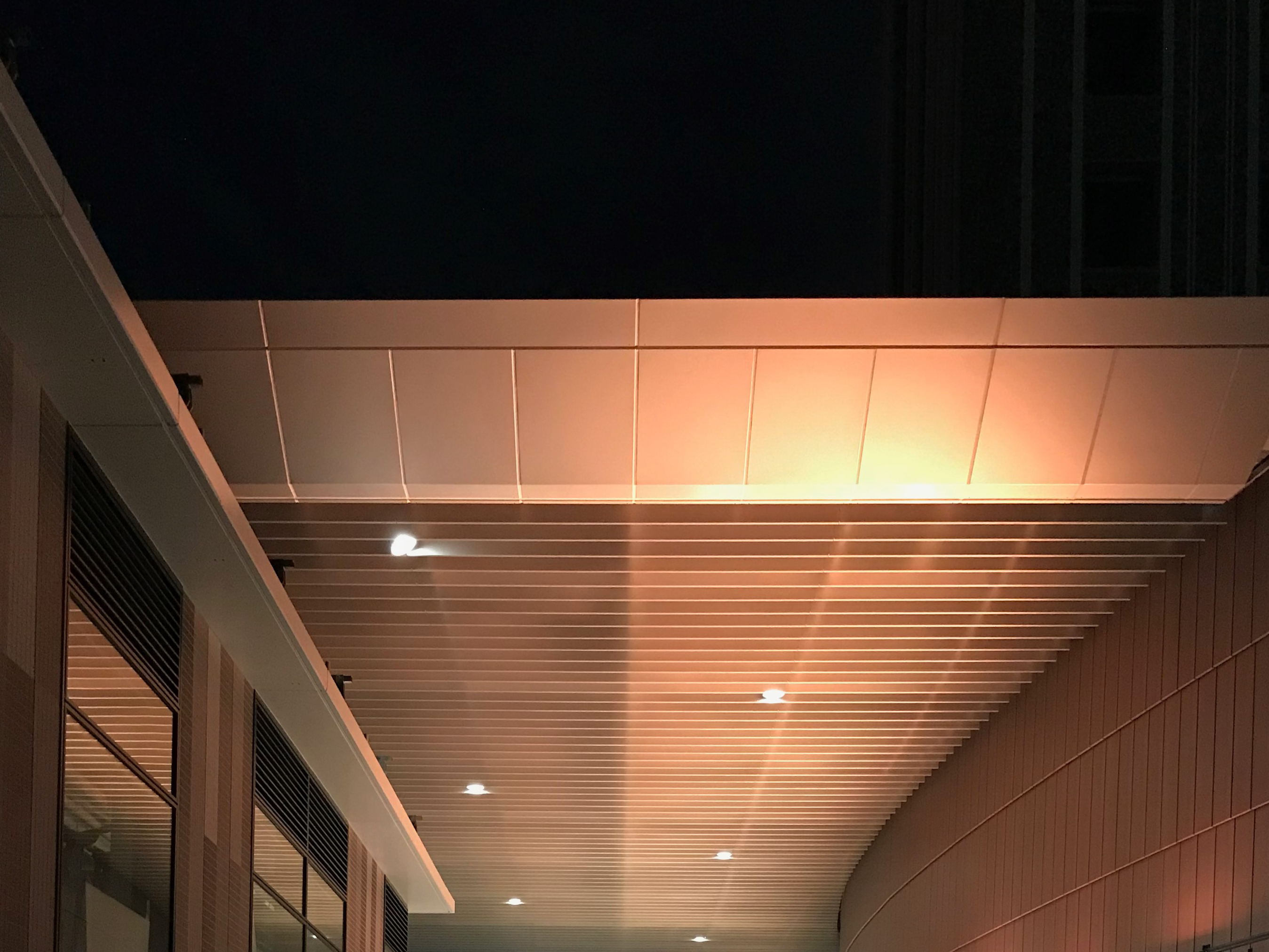 Du côté centre commercial, le grand auvent a également été magnifié en blanc afin d’exprimer la continuité du complexe. De même, l’éclairage paysager et des circulations extérieures renforcent cet effet, tout en exaltant le design des architectes d’Azusa Sekkei.