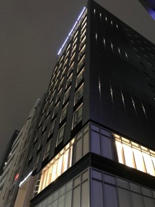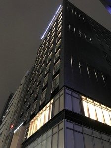 Pour la façade de cette immense tour-hôtel, des spots ont été adaptés pour créer une lumière très blanche, faisant ressortir le carrelage qui la recouvre.