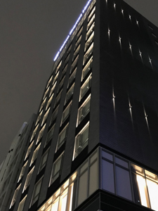 For the facade of this high hotel tower, semi-custom-made spots were adapted to create a very white light, bringing out the tiling that covers it.