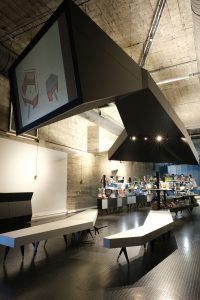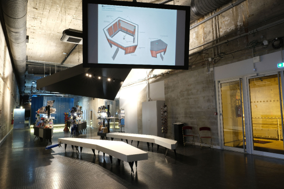 L’espace d’accueil, de 240 m², est une alvéole de l’ancienne écluse fortifiée de Saint-Nazaire, au rez-de-chaussée du bâtiment. Il est partagé entre deux équipements touristiques : le Centre éolien et le sous-marin Espadon. La difficulté consistait, à partir d’un seul lieu, à guider les visiteurs vers les deux espaces d’exposition ainsi que les sanitaires. « Ici, la lumière fédère les lieux et les identifie, les singularise en même temps, poursuit Rozenn Le Couillard. Nous sommes dans un espace dont la fréquentation peut atteindre 1 200 visiteurs par jour en période estivale, sans lumière naturelle, avec un mobilier potentiellement modulable ».