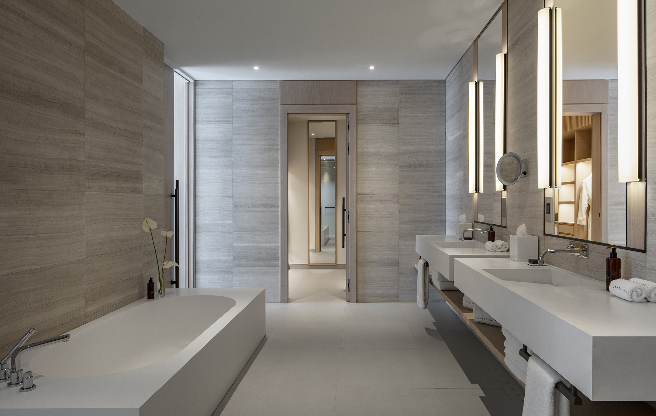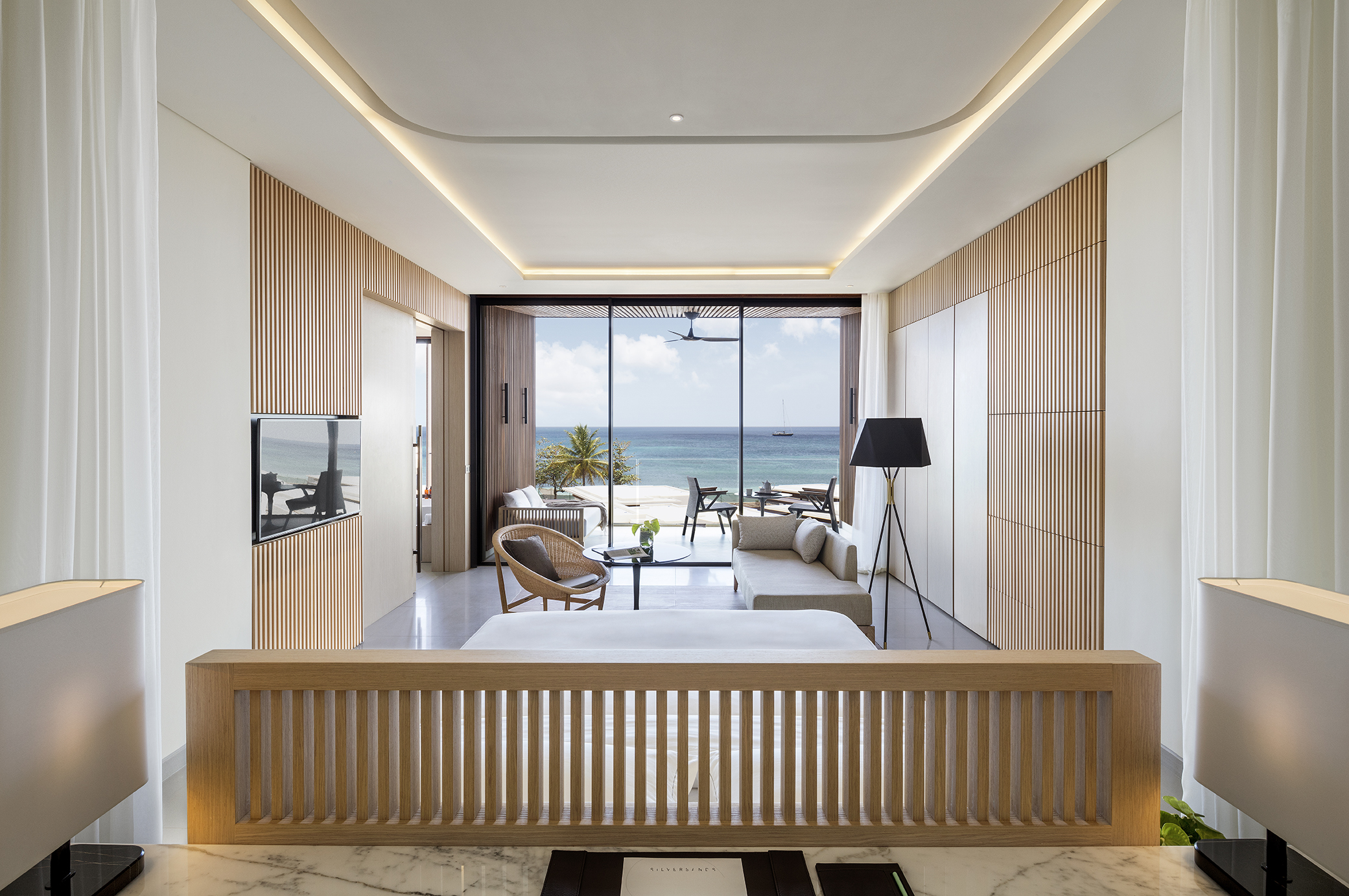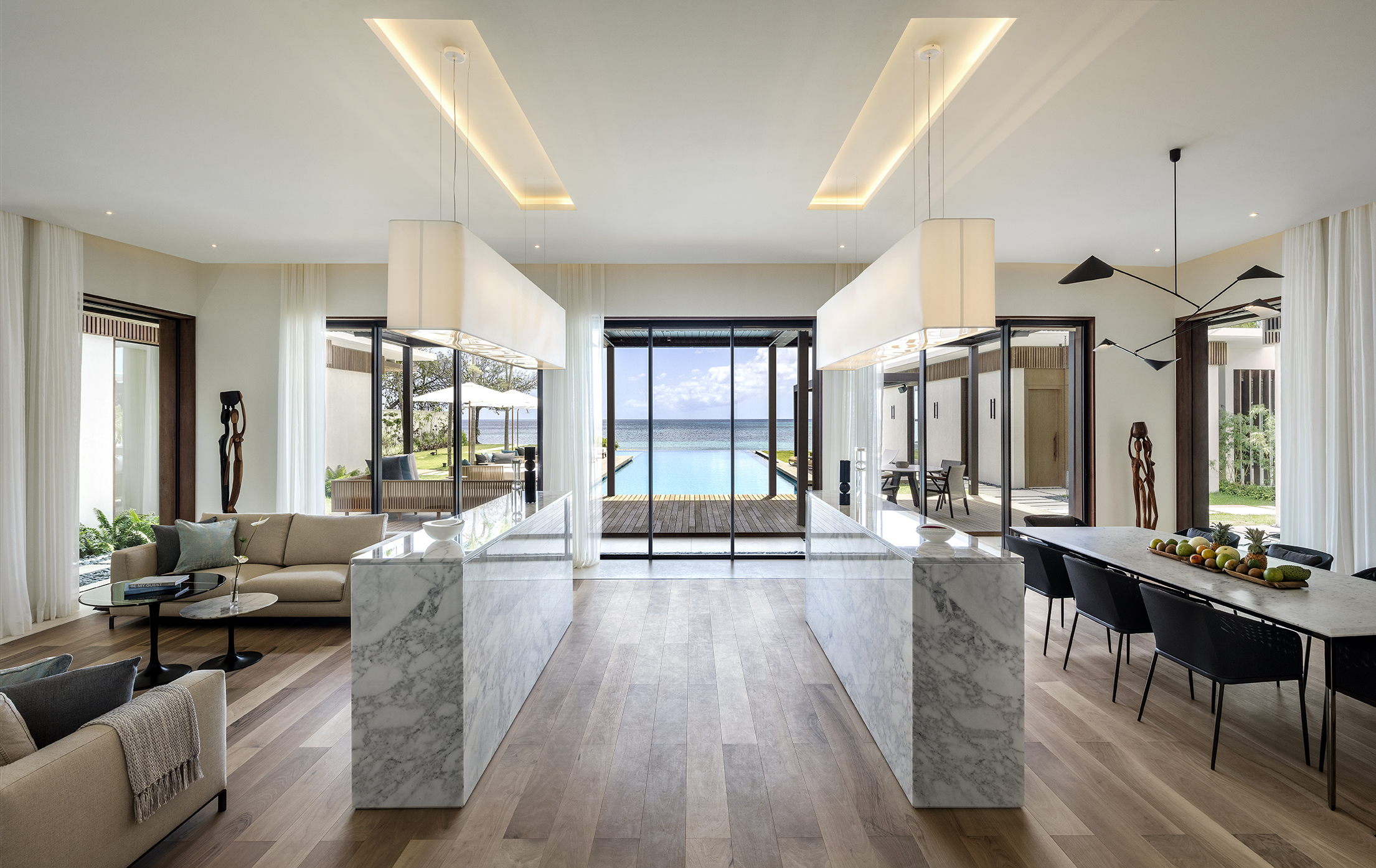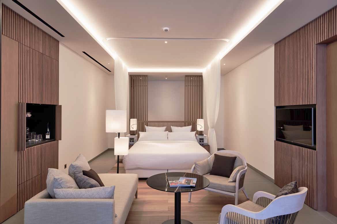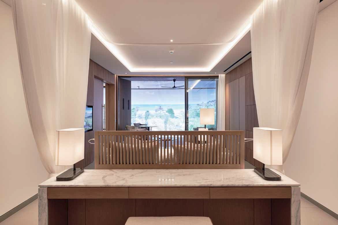 La séquence d’arrivée est particulièrement soignée avec un grand hall ligné en bois qui ouvre sur un bassin de 100 mètres de long orienté vers la baie et la mer. L’enchaînement des espaces extérieurs offre des expériences variées : jardins, patios, et toutes les variations sur les jeux d’eau.