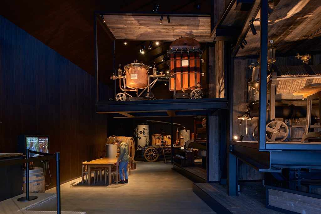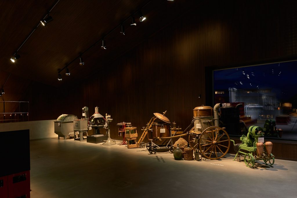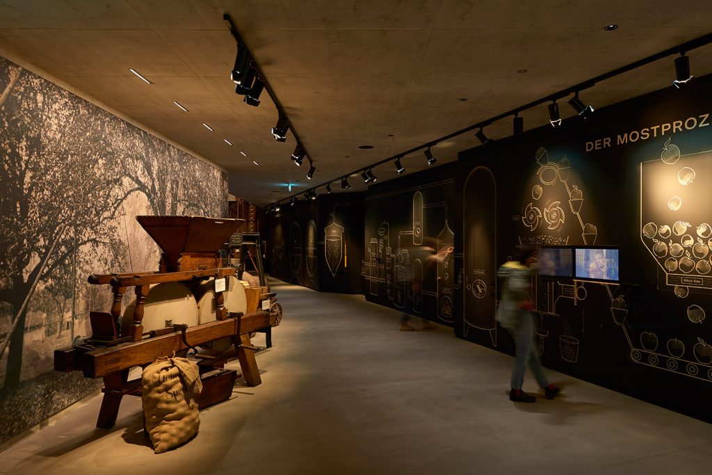 La lumière scénographique crée des hiérarchies dans l’espace et guide le regard du visiteur qui évolue à l’intérieur du musée, revêtu de planches de bois foncé, dans une atmosphère générale sombre, qui rappelle l’intérieur d’une grange. Les forts contrastes clair-foncé créent une tension visuelle et donnent de la vitalité aux anciens équipements de production du moût, en les sortant de l’obscurité.